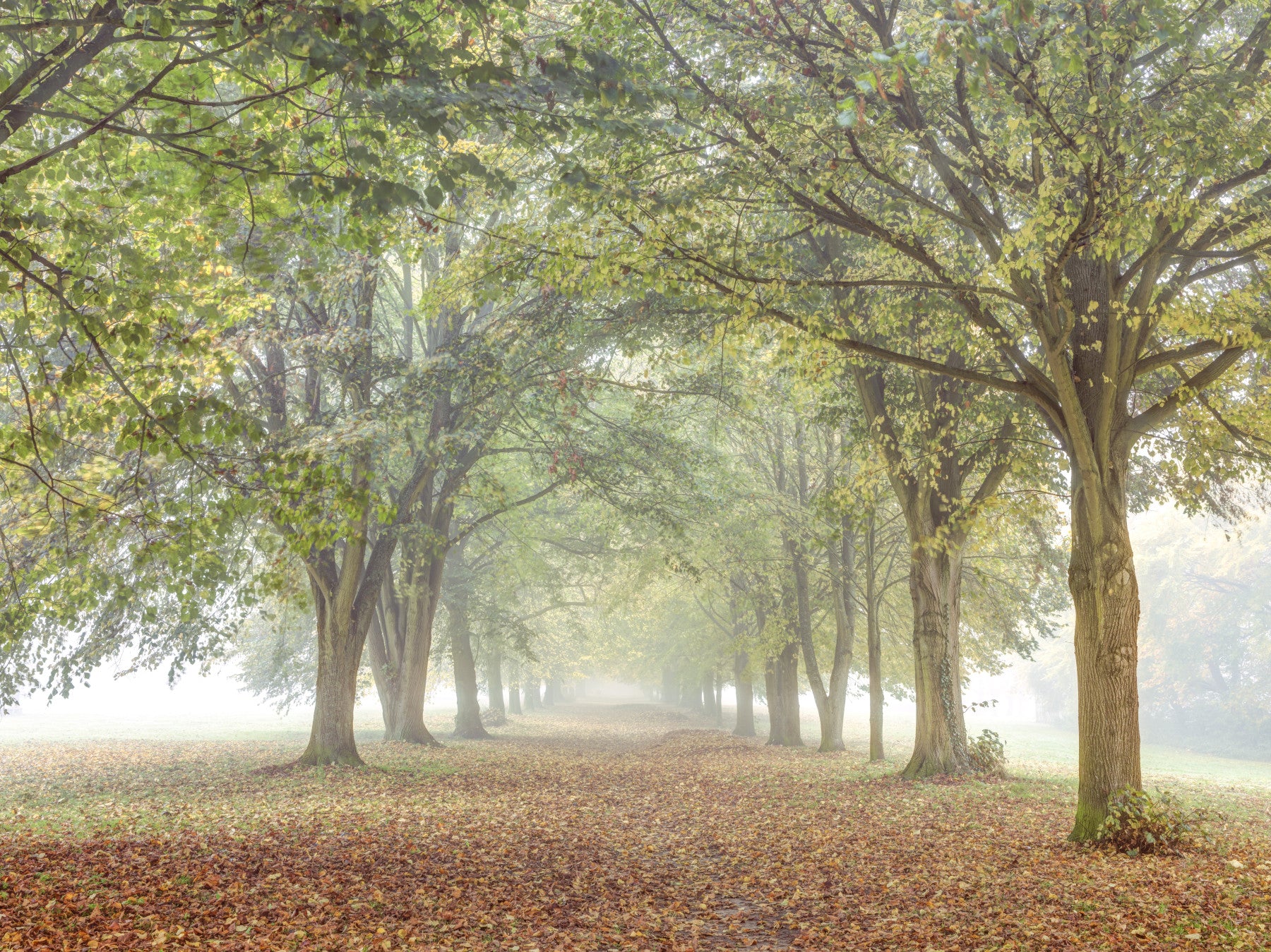 The trees are tall and their forms are softened by the mist.