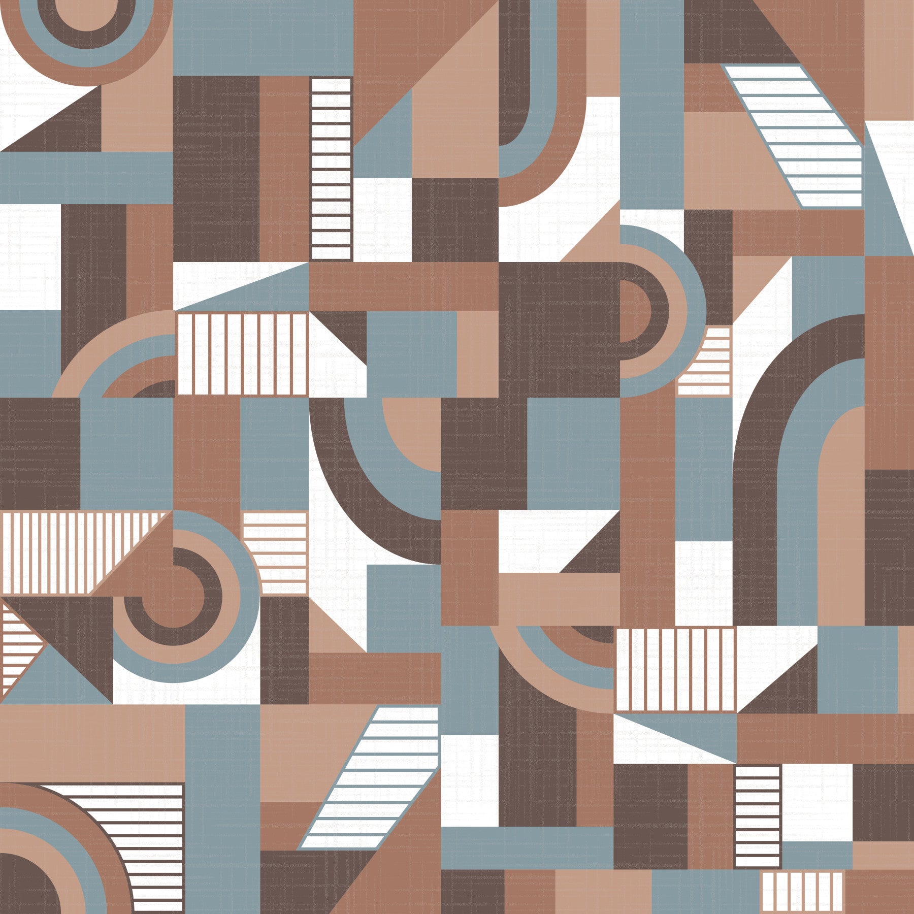 Indulge your senses with Mocha Mousse Sonata a geometric wallpaper that harmonizes warm and cool tones in a delightful visual composition. This design is an ode to modern simplicity, blending mocha browns and muted blues in a symphony of shapes and textures. The interplay of circles, squares, and triangles creates a rhythmic pattern that’s both calming and captivating. White accents provide a crisp contrast, adding a layer of sophistication to the overall design. Subtle textured overlays soften the geometric forms, giving a tactile impression. This wallpaper's understated elegance will create a warm and inviting space. "Mocha Mousse Sonata" is perfect for creating a contemporary living room, a peaceful bedroom, or a stylish office, providing a backdrop that is both aesthetically pleasing and conducive to relaxation and creativity.