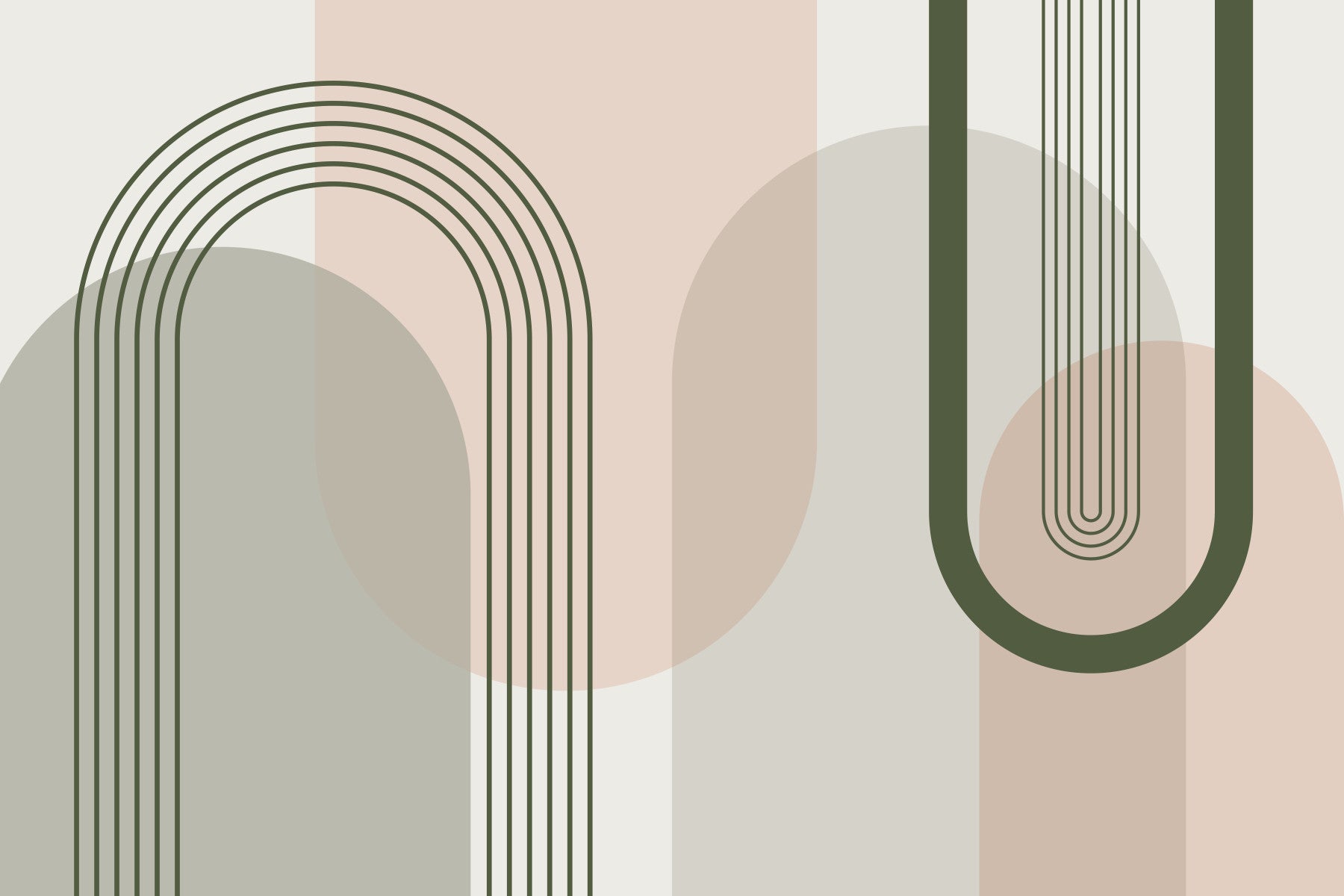 Transform any room with this captivating wallpaper for walls, showcasing a modern, abstract design. Olive green arches and lines complement soft peach and gray circles and blocks. The simple, clean composition makes a statement without overwhelming the space. Ideal for a bedroom, hallway, or living room, this design brings a subtle touch of art and balance to your interior. It creates a sophisticated focal point and works well with various decor styles.