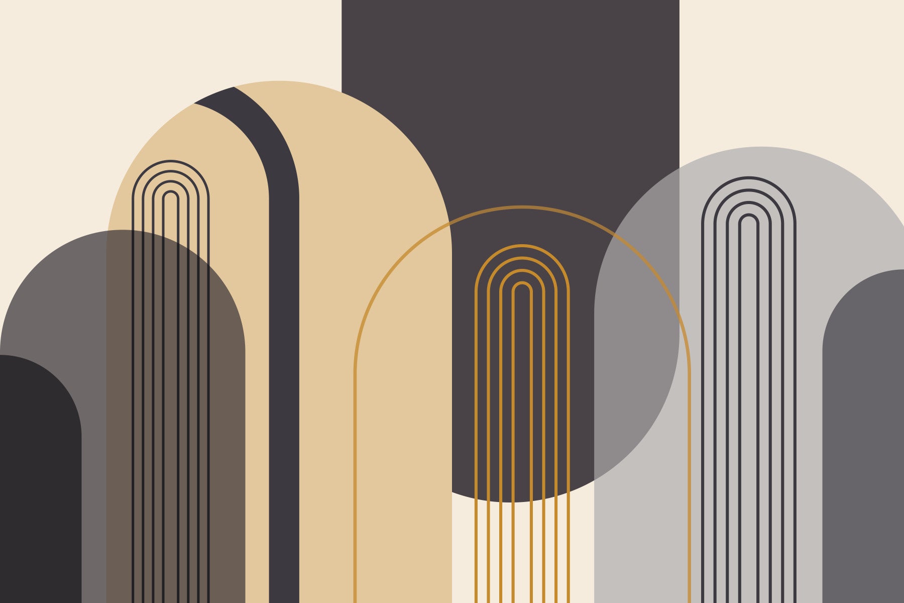 This modern wallpaper design adds a stylish touch to any room. Arches intersect in a balanced composition, using muted beige, charcoal, and gray tones with striking gold accents. The vertical lines create the illusion of added height, bringing a spacious feel. It is a distinctive wallpaper for walls choice for the living room, hallway, or even a minimalist bedroom, enhancing the overall style with its sophistication and simple beauty. This artwork offers a unique perspective.