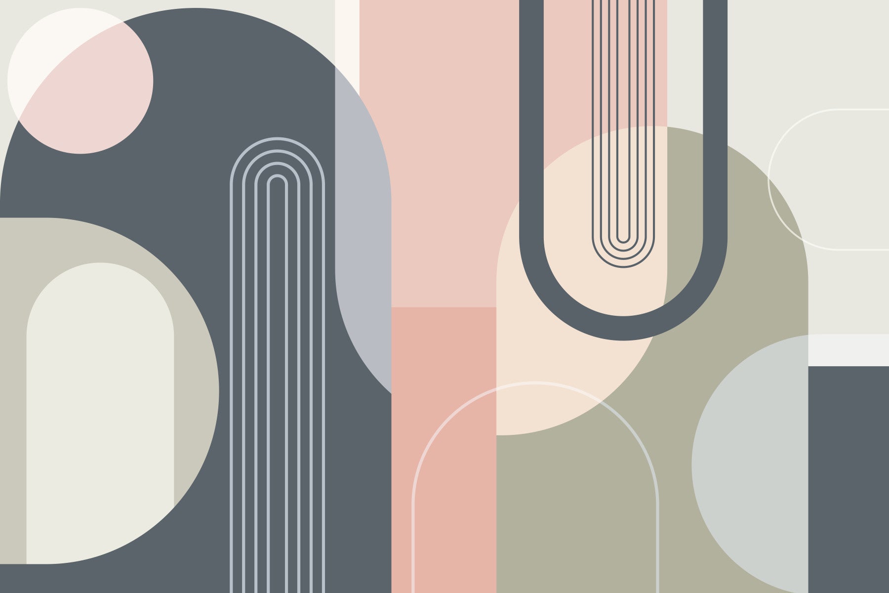The design presents a contemporary arrangement of geometric forms. Notice the gentle arcs interweave with linear patterns. A soft palette of blush pink, dove gray, and muted greens makes it a soothing choice. This design elevates interiors, blending effortlessly with modern decor. Imagine it as wallpaper for walls in your dining room, bedroom, or even a chic hallway. It introduces a feeling of spaciousness. The careful balance of colors and forms brings a sense of harmony to your home, enriching your living spaces with understated sophistication.