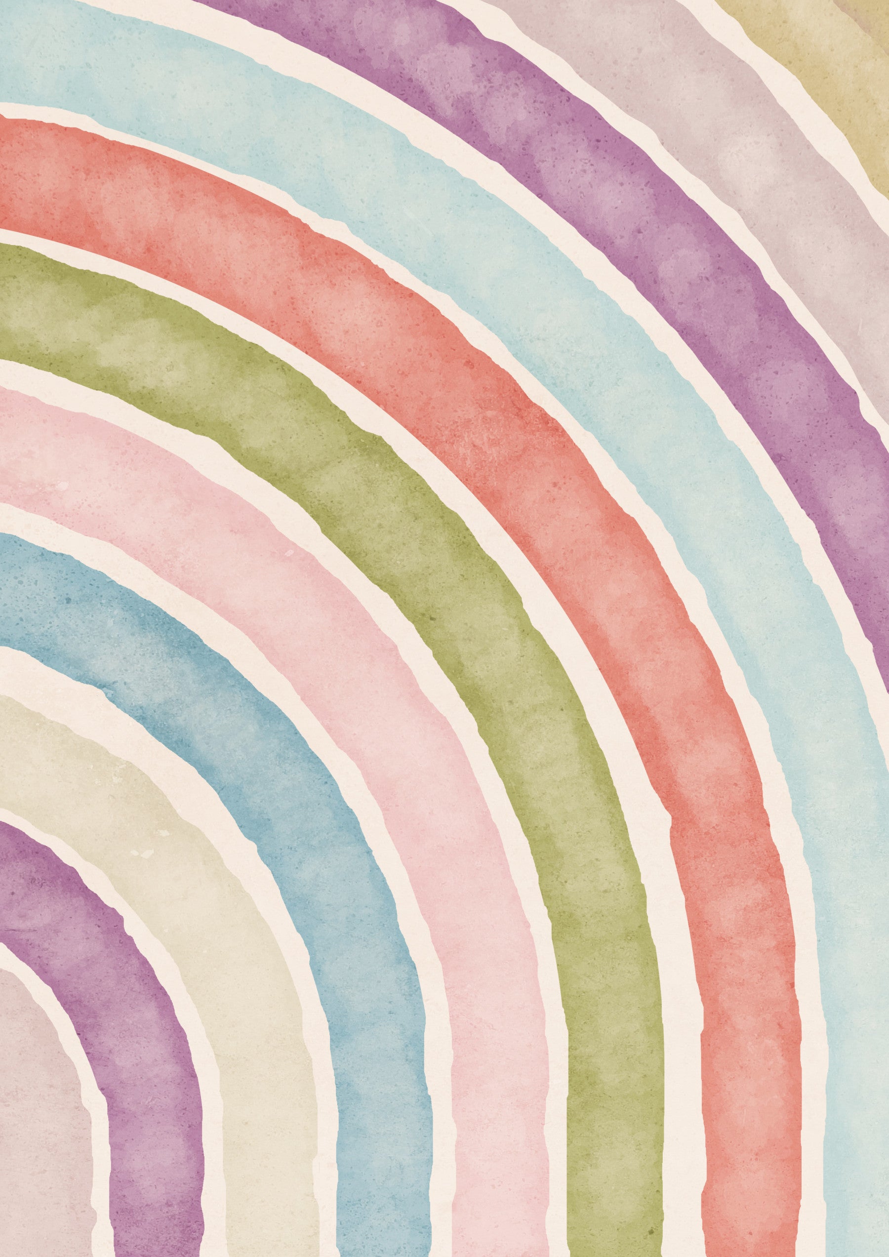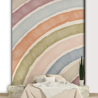 This wallpaper offers a modern take on the classic rainbow theme. The design features a series of elegantly curved arches in a sophisticated palette of muted colors, creating a minimalist yet visually striking effect. The subtle color variations and the smooth transitions between hues evoke a sense of calm and balance. The lack of sharp lines and the soft watercolor texture add to the overall feeling of serenity. This wallpaper is perfect for contemporary interiors, adding a touch of sophistication without being overwhelming.