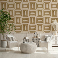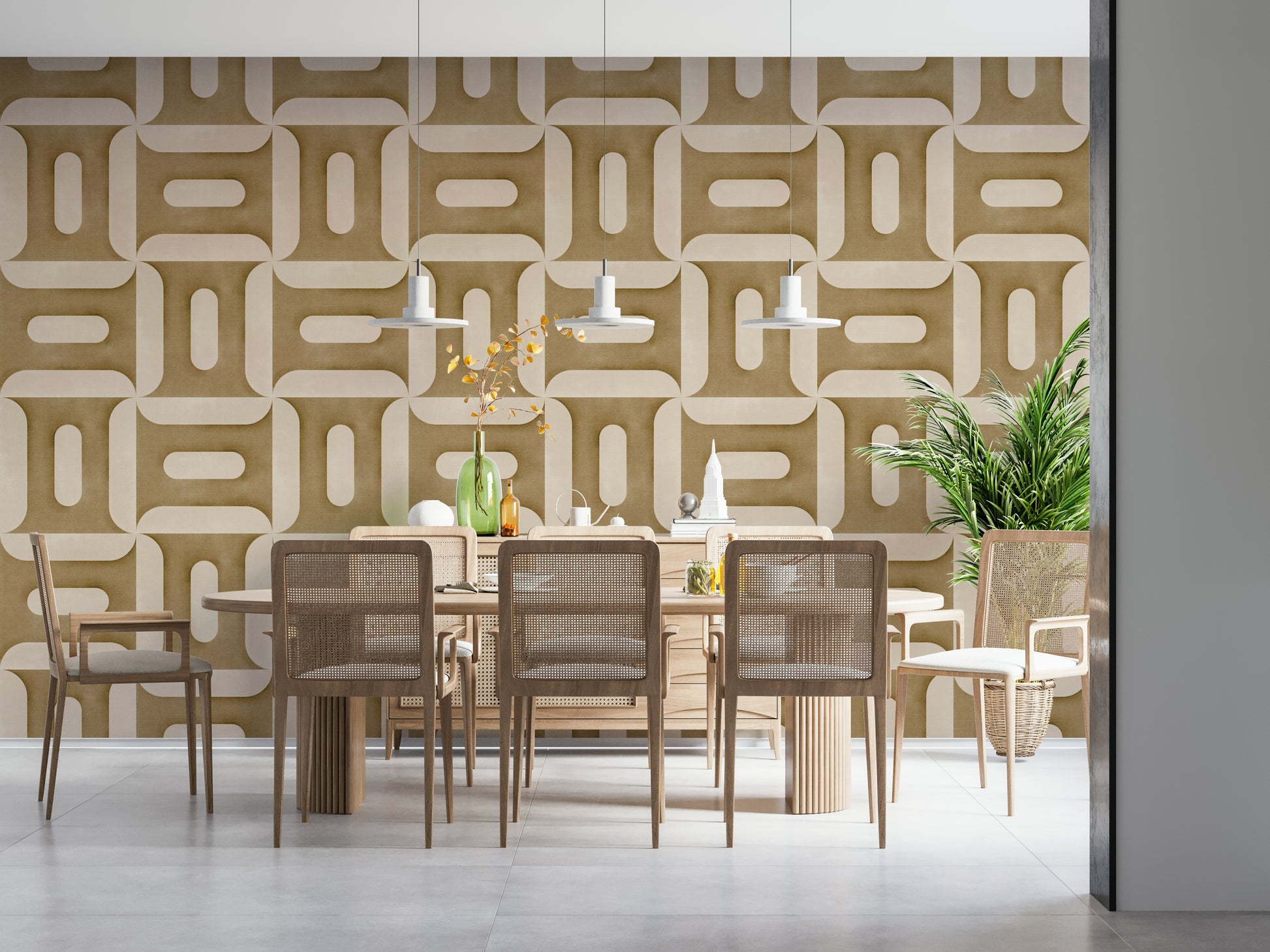 Introduce a touch of mid-century modern sophistication to your space with "Modern Textured Geometries Camel." This design features a captivating interplay of rounded geometric forms in a warm, inviting palette of camel and creamy beige. The subtle textural effect adds depth and dimension, creating a tactile experience that enhances the visual appeal. The repeating pattern offers a sense of rhythm and balance, making it an ideal choice for creating a feature wall or adding a subtle statement to any room. Evoking a sense of calm and understated luxury, this wall covering provides a versatile backdrop that complements a range of interior styles, from minimalist to eclectic. The neutral color scheme ensures it blends seamlessly with existing decor while adding a touch of refined character. Elevate your interior aesthetic with this timeless geometric design.