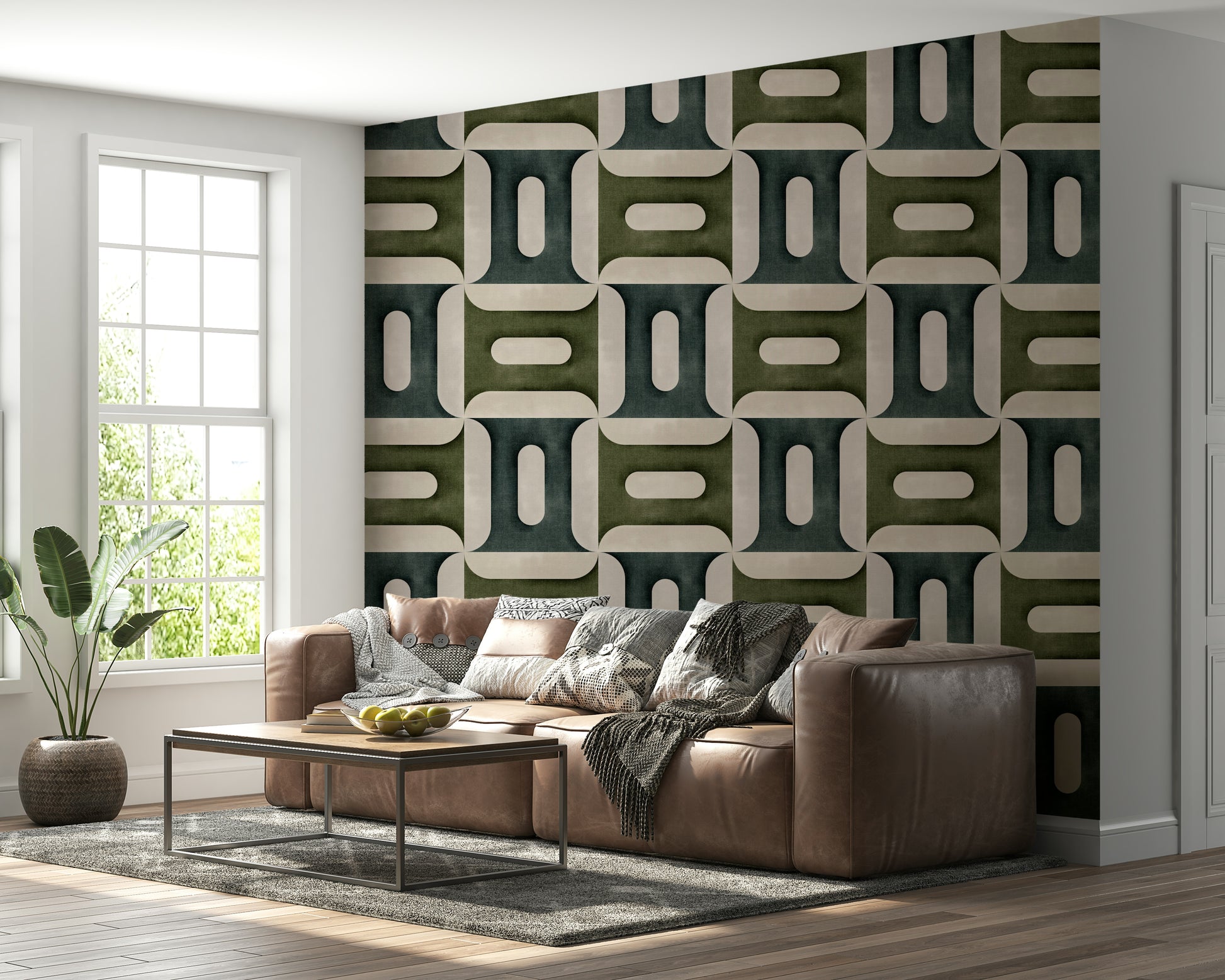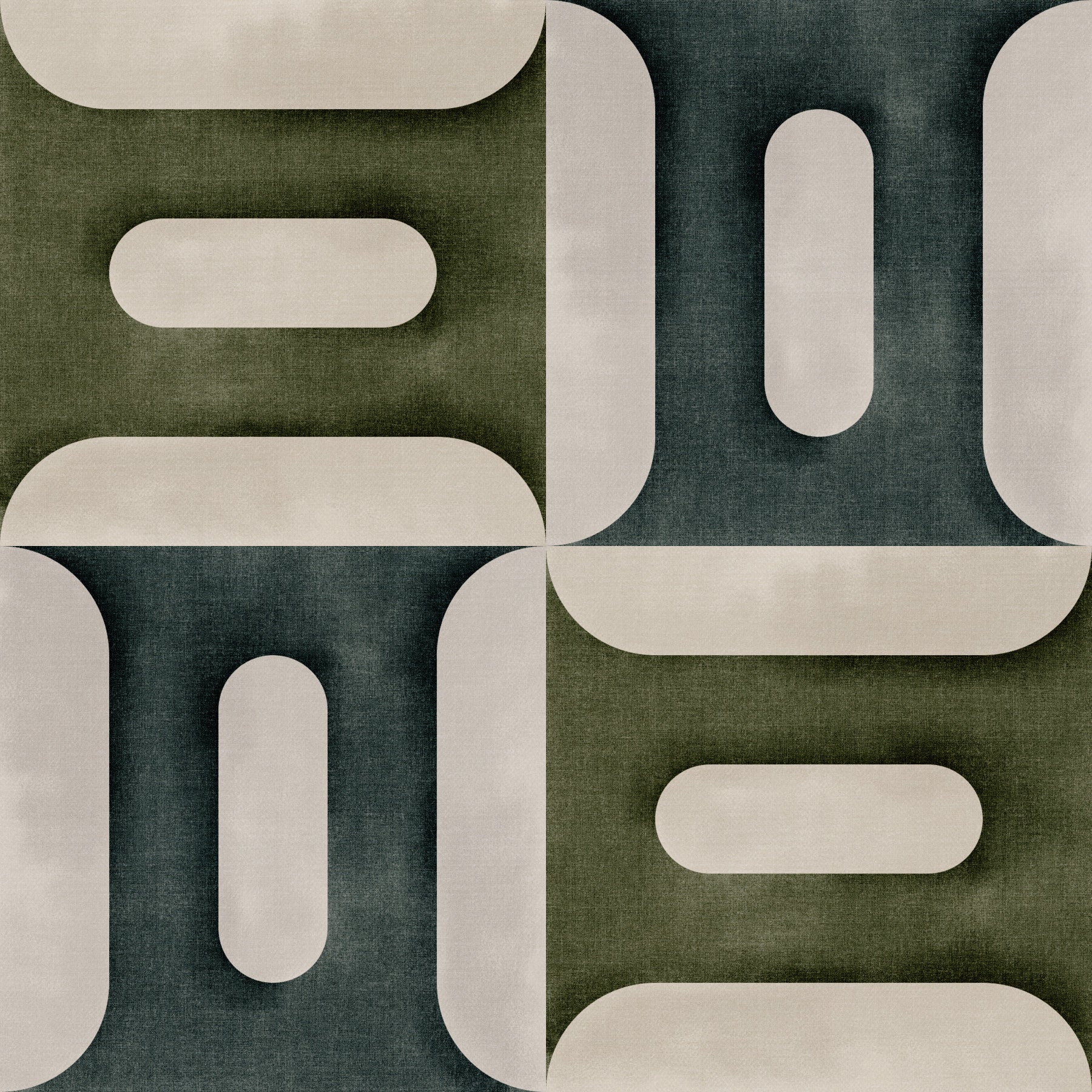 Embrace the serene stillness of winter with "Modern Textured Geometries Winter," a captivating wall covering that harmonizes contemporary design with the cozy comfort of texture. The pattern features a sophisticated interplay of rounded geometric forms in muted, earthy tones like deep teal and calming sage green, reminiscent of frosted landscapes and evergreen boughs dusted with snow. Contrasting these are the soft, warm neutrals that evoke the feeling of a cozy winter cabin, creating a visual balance that is both striking and soothing. The subtle texture adds depth and dimension, inviting touch and lending an organic quality to the modern aesthetic. This piece offers a unique blend of visual interest and tranquil ambiance. It's perfect for creating a focal point in any room, infusing your space with a sense of understated luxury and wintry charm, ideal for creating a statement wall that is elegant and sophisticated.