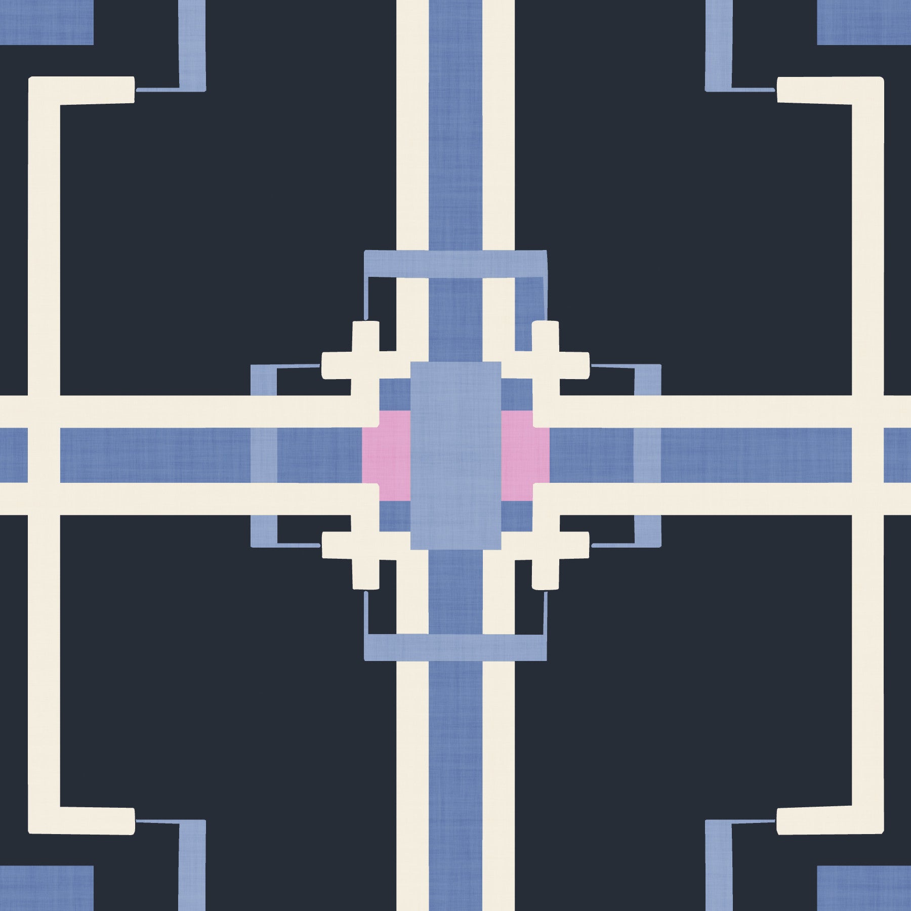 This stylish geometric wallpaper design features a bold grid pattern. Thick lines in varying shades of blue and cream create a striking visual impact. The hint of pink adds a touch of warmth to the cool color palette. Use this wallpaper for walls in an office, dining room, or bedroom to add an element of modern chic. Its orderly layout complements minimalist and contemporary interiors.