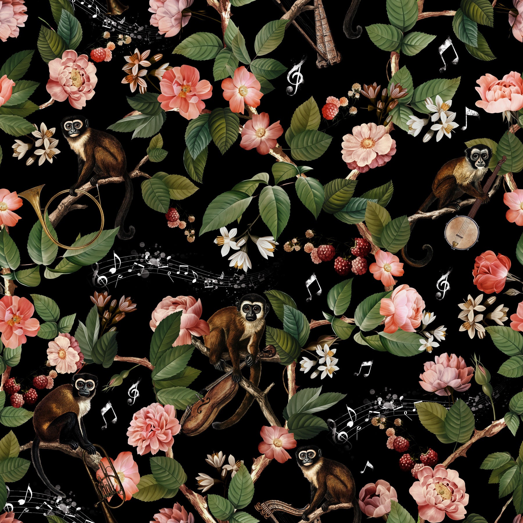 This vibrant wallpaper transports you to a lush, musical jungle. Intricate watercolor illustrations of monkeys playing musical instruments are nestled amongst blooming pink roses, raspberries, and lush green leaves. The playful design is set against a dramatic black background, enhancing the vibrancy of the colors and adding a touch of mystique. A subtle scattering of musical notes further emphasizes the theme of music and nature, creating a delightful and unique atmosphere for any room. The detailed botanicals and realistic monkey depictions combine to create a truly memorable piece.