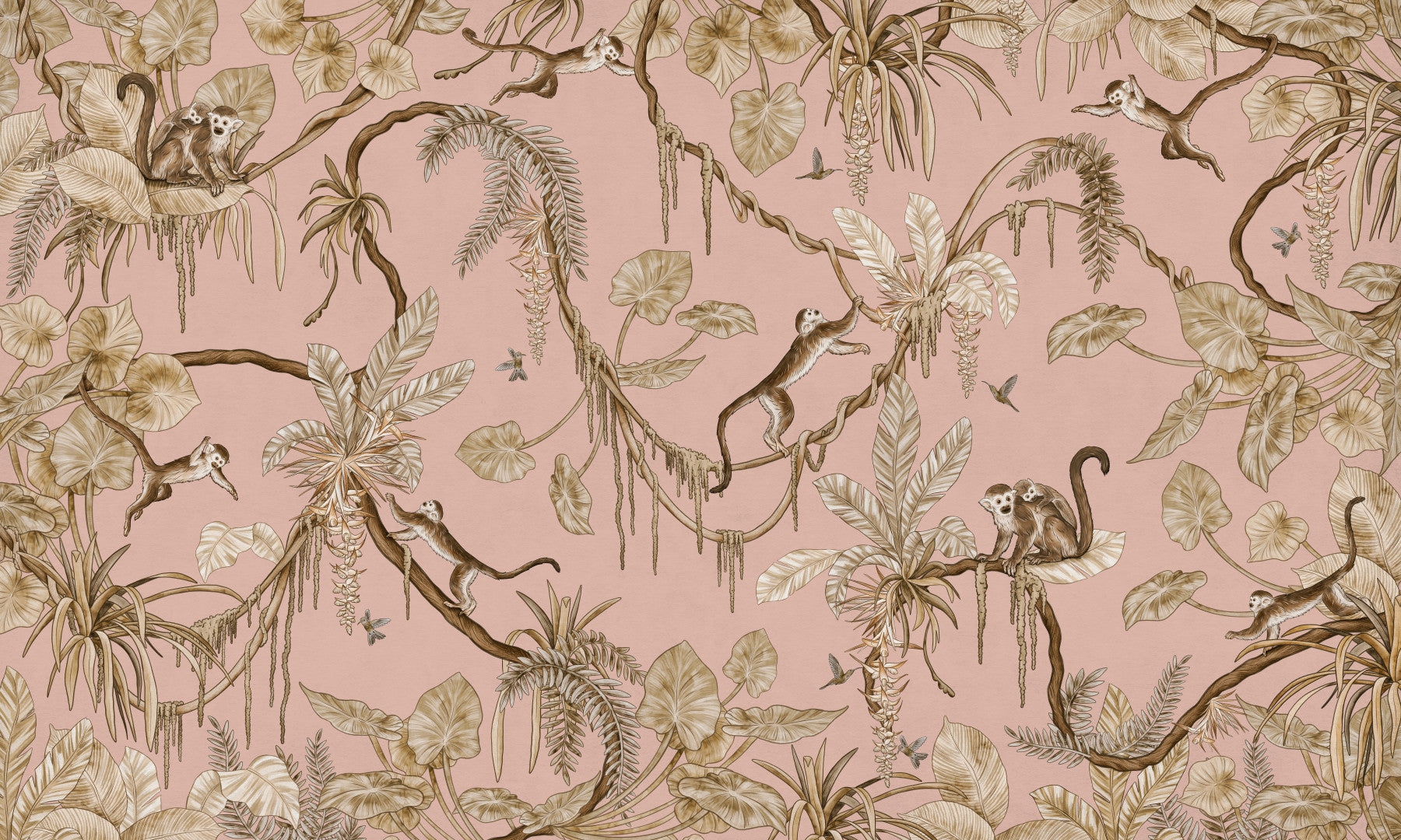 Tropical scene in blush tones of the Monkey Grove Blush Wall Mural.