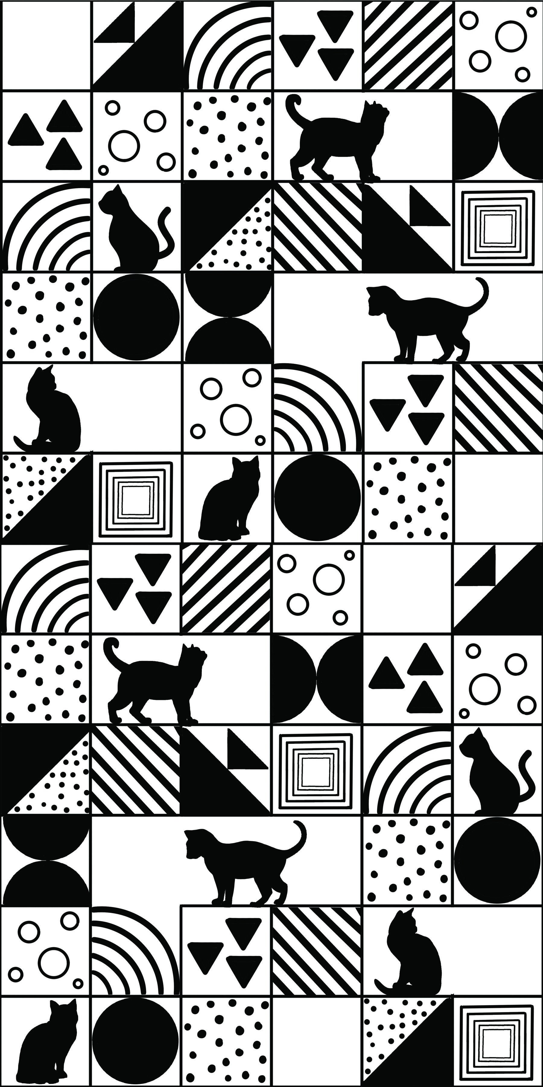 Sharp black squares and playful feline shapes collide in a rhythmic grid that builds a sense of movement across the surface. This premium wallpaper uses a classic monochromatic palette to organize a variety of geometric textures, from polka dots to stripes and concentric lines. Every tile within the maze reveals a new detail, such as a sitting kitten or a strolling silhouette, nestled among triangles and arches. By balancing heavy solids with delicate line work, the composition creates a striking visual depth that anchors any specialized project with ease. The high-contrast imagery ensures every graphic remains clear and bold, offering a sophisticated take on whimsical animal themes. It provides a timeless foundation for those who enjoy structured yet energetic patterns on their walls.