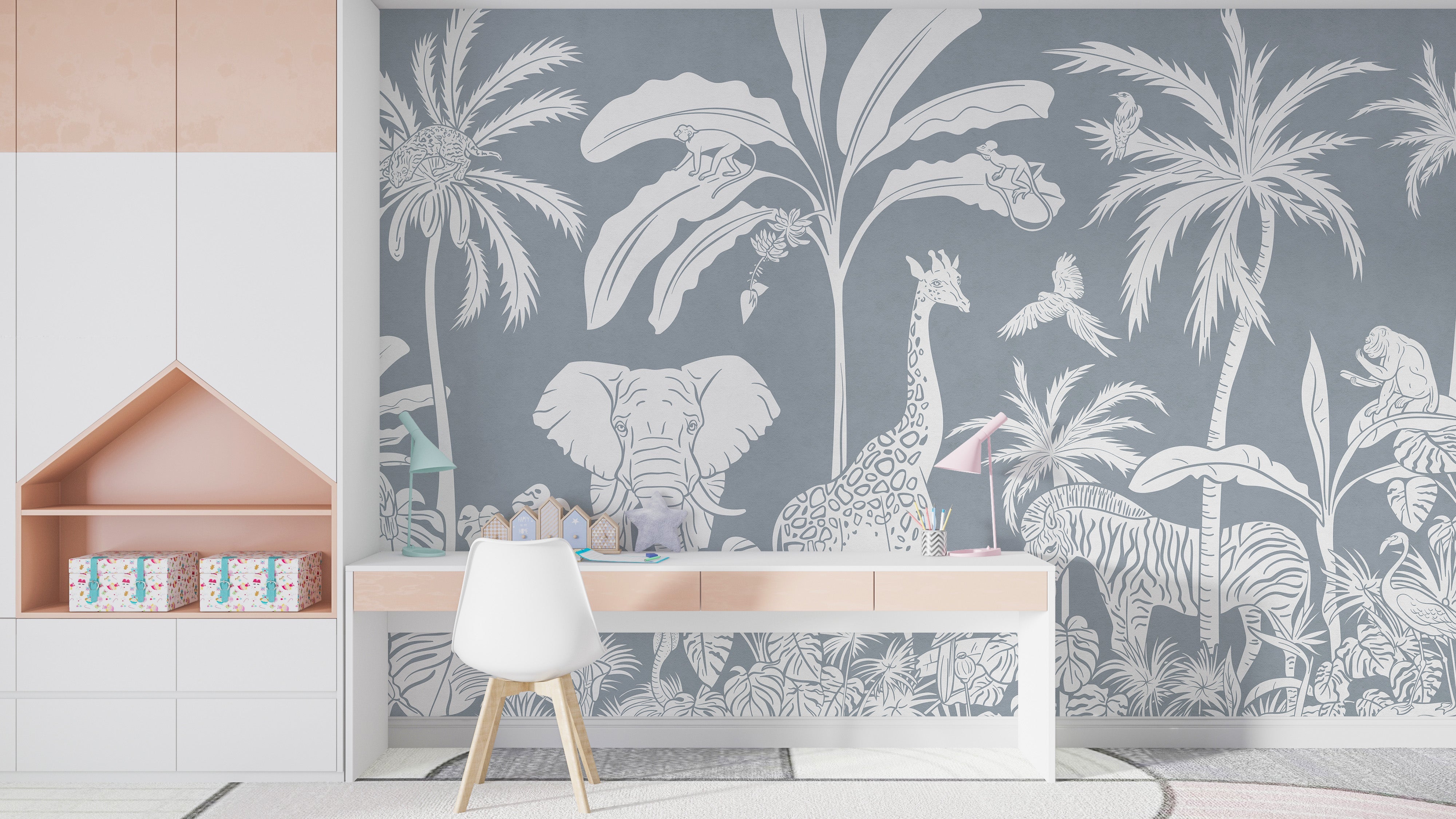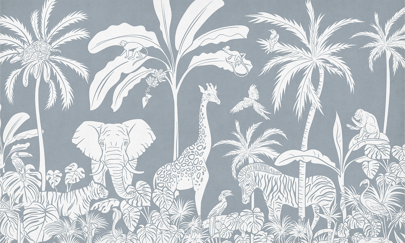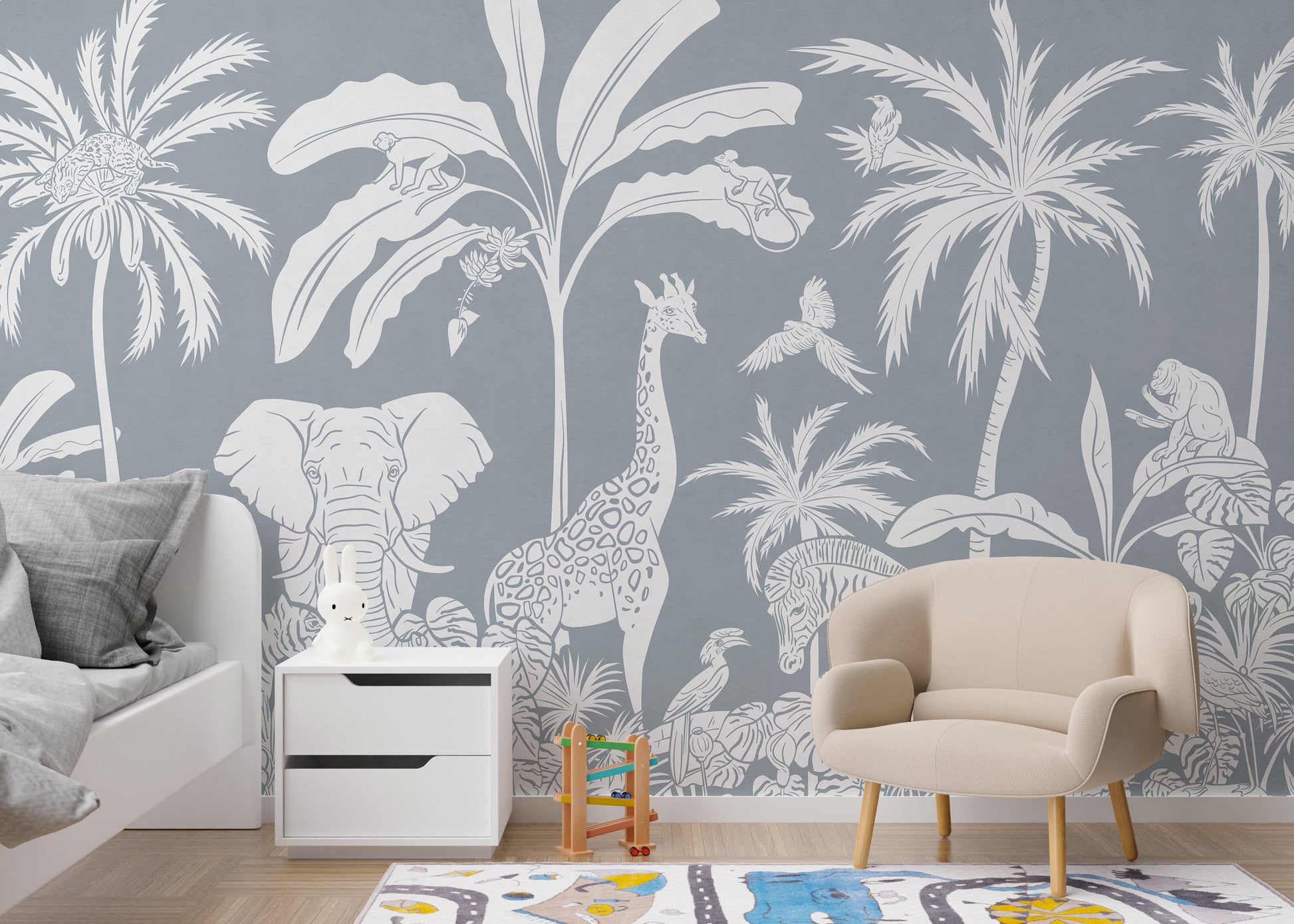 Add fun and adventurous style to the room of your child with this monochrome jungle blue mural. This kid's animal wallpaper boasts rich illustrations of detailed jungle animals, from elephants to giraffes and zebras, monkeys against calm jungle blues, all in monochrome, giving it a modern touch that works with most room styles. Its material is very strong and clean-friendly. It will look beautiful for many years, making it perfect for inspiring creativity and love for nature in your child. Shop for the Monochrome Jungle Blue Wall Mural today and enjoy free shipping!