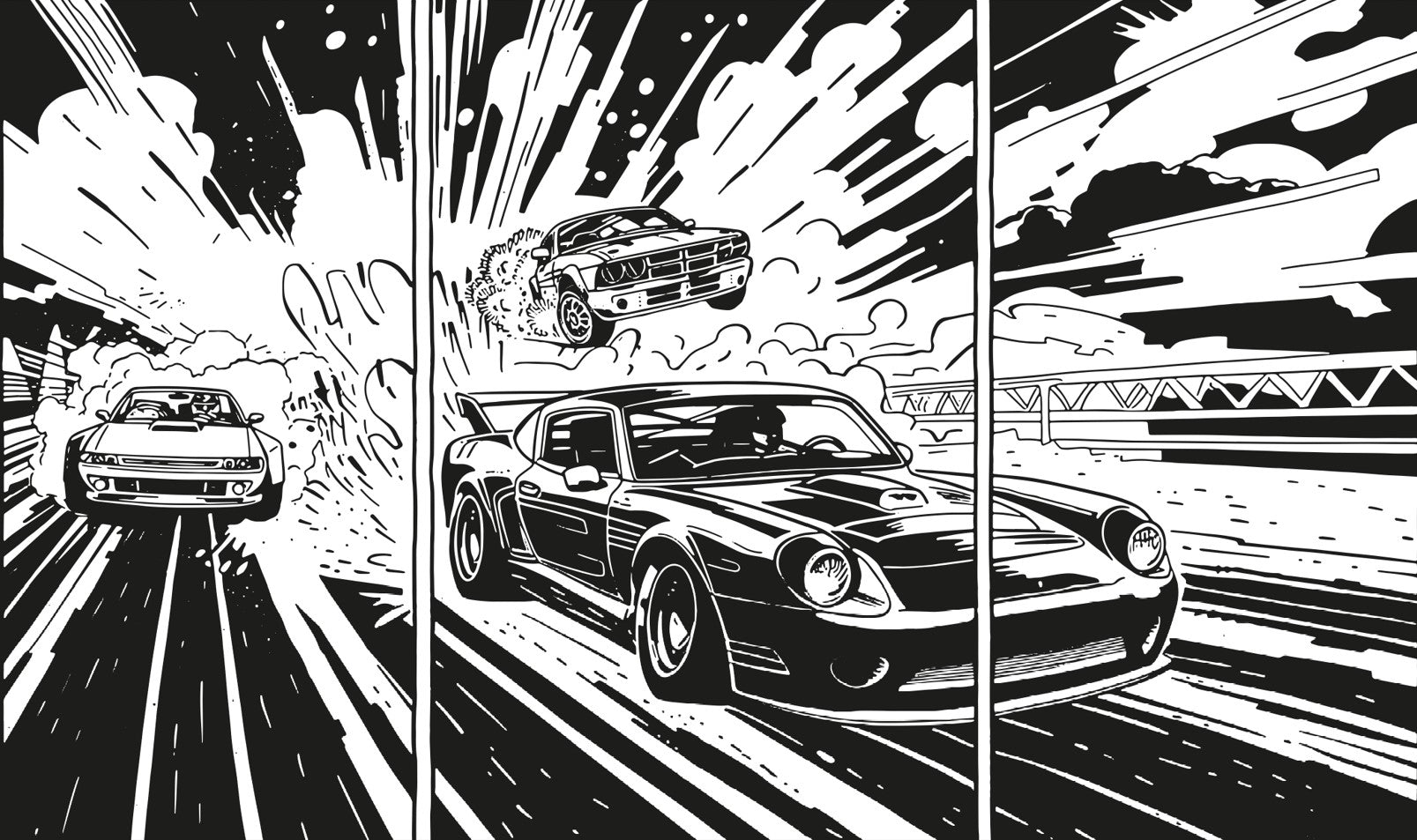 Get your adrenaline going with this Monochrome Muscle Car Wallpaper. Based on vintage comic book illustrations, this energetic black-and-white mural depicts muscle cars in motion and flow smoke swords from out of combustion created by high-speed vehicles. This is an aggressive design, bold lines and cut angles makes this one for the car guys the garages, game rooms or any space looking for an aggressive look. Give your interiors life stealing from racing history.