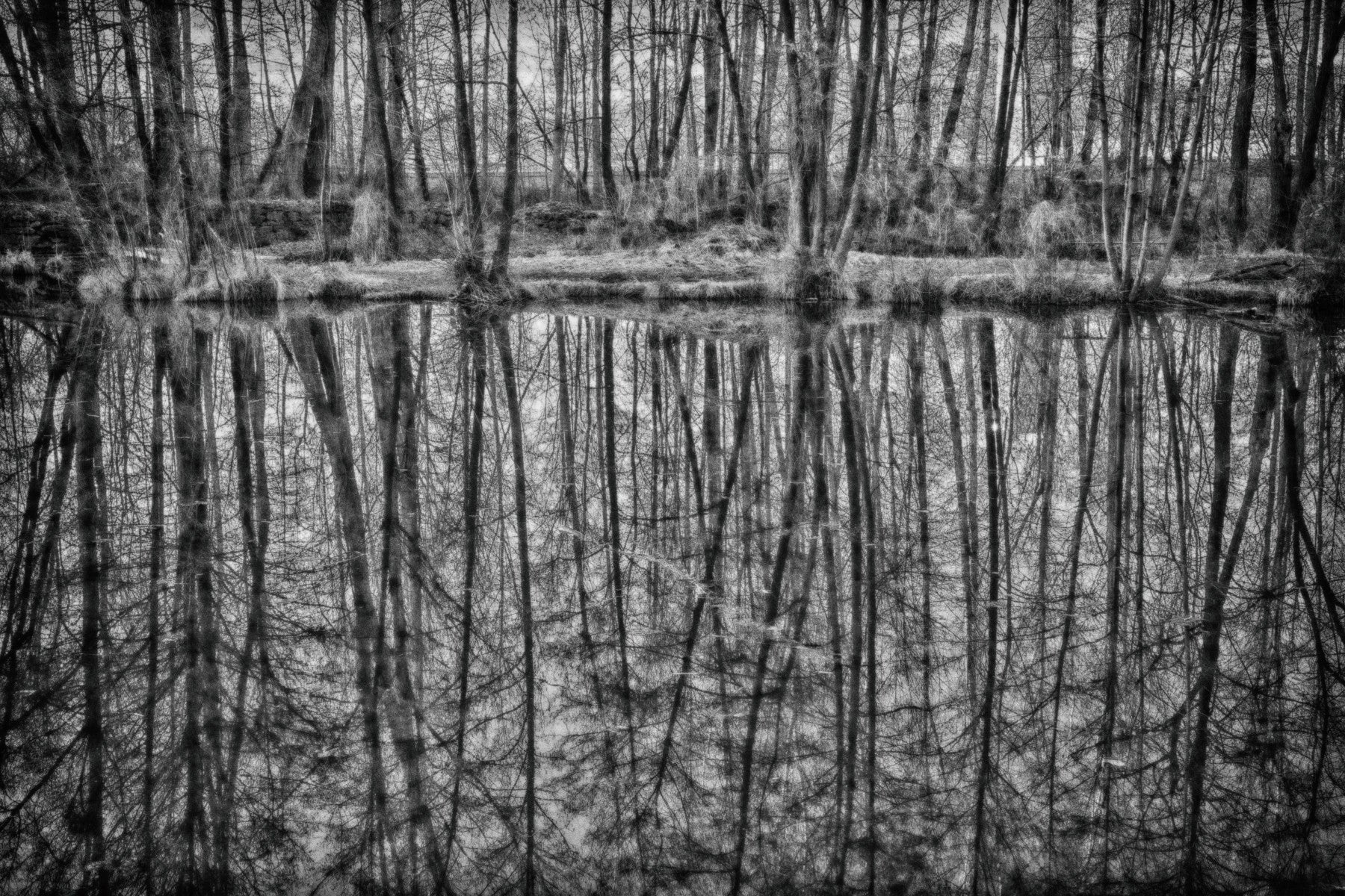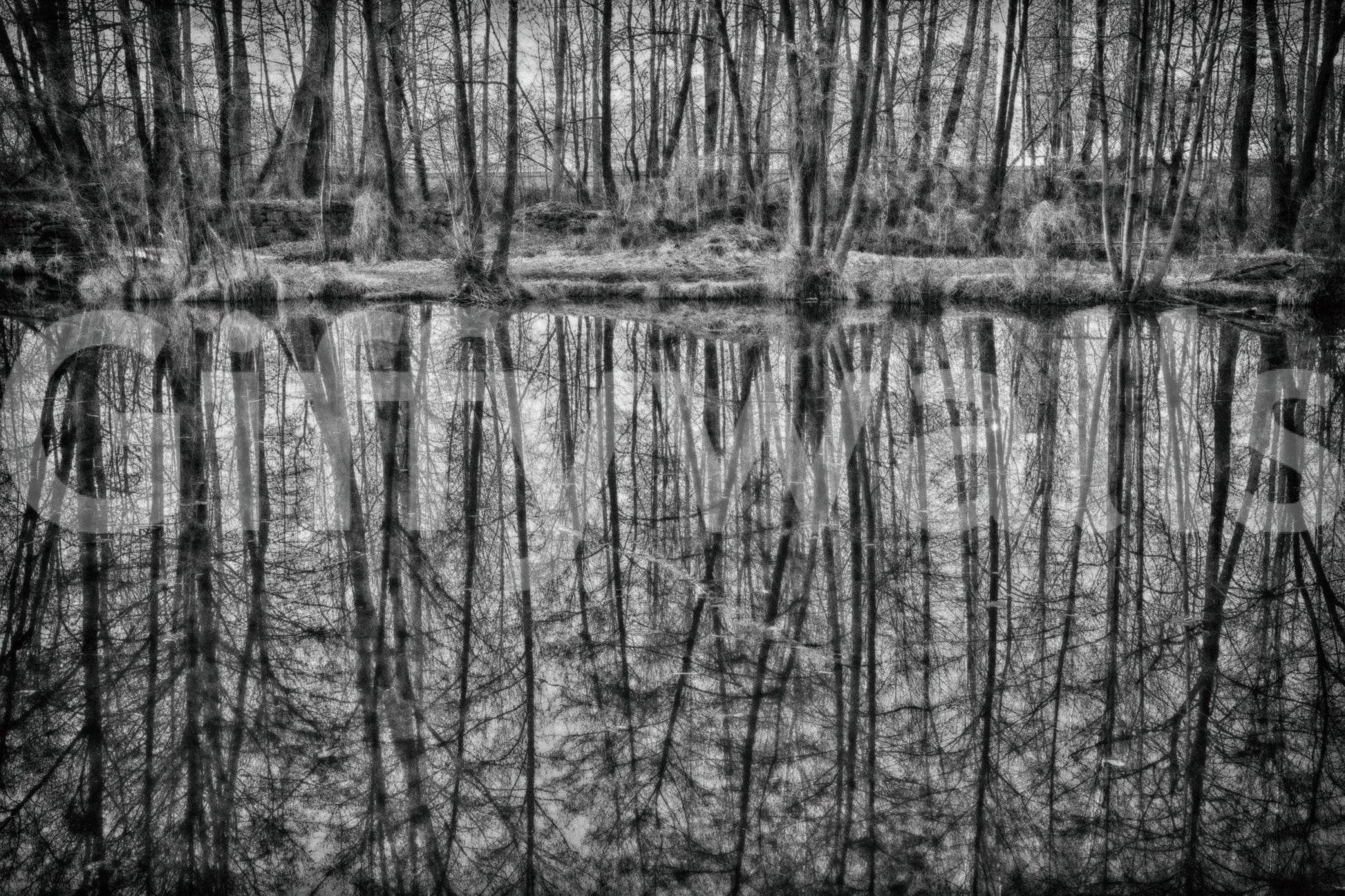 This striking monochrome photograph presents a tranquil scene where trees stand tall, their reflections perfectly mirrored in still waters. The interplay of light and shadow reveals the intricate details of the branches, creating a sense of depth and calm. Ideal for those seeking to enhance their space with a touch of nature's elegance, this artwork embodies serenity and invites contemplation. Perfect for a living room, office, or any area that could benefit from a peaceful ambiance.