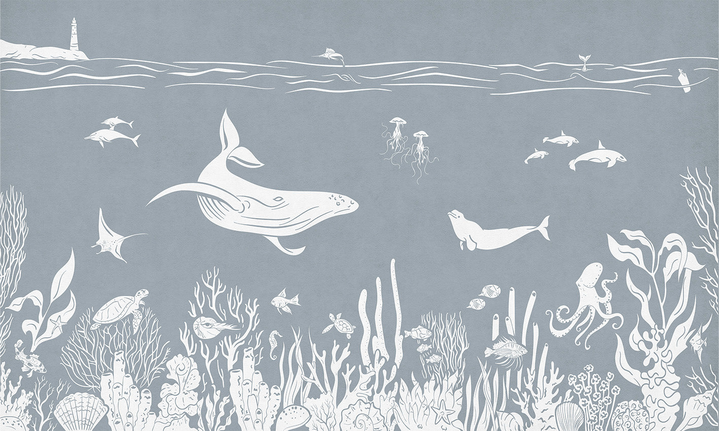 Add charm to the deep blue sea in a monochromatic sea-blue wall mural that holds designs depicting minute marine-life artwork of whales and dolphins among intricate coral reef impressions. These wallpapers that seem to open underwater into every space make this a distinct, perfect enhancement with your marined theme into each of the room walls because it contains superior quality printing, ensuring rich colour stay. This wallpaper mural is ideal for living rooms, bedrooms, or children's rooms, as it captures the essence of the ocean. Order the monochrome sea blue wallpaper mural now and create an underwater sanctuary in your home.