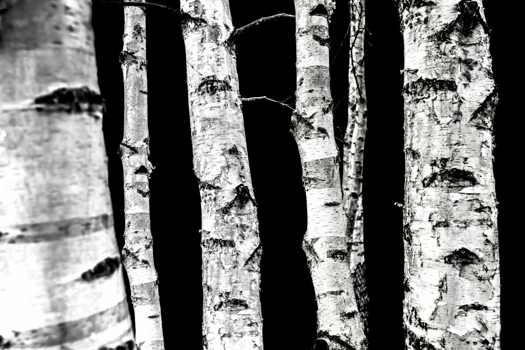 Stylish dark-and-light birch tree wallpaper in a Monochrome Woods style.