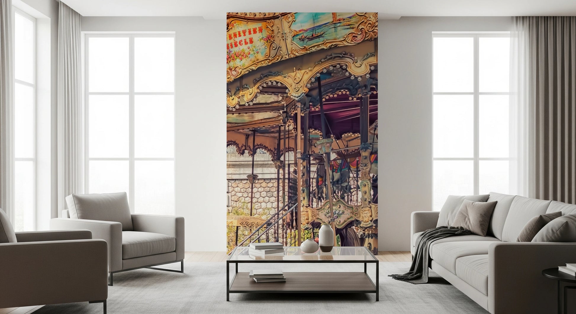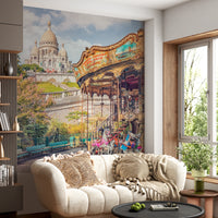 Bring the spirit of Montmartre to your walls with this delightful wallpaper for walls. A beautiful carousel takes center stage, inviting you to step onto a timeless ride. The Sacré-Cœur Basilica rises majestically in the background, adding a touch of grandeur to the scene. Warm tones of beige and rose with touches of blue harmonize with the surrounding greenery. This mural creates an uplifting and cheerful atmosphere in dining rooms, living rooms, or even hallways. It evokes the feeling of a sunny Parisian day and the joy of simple pleasures.