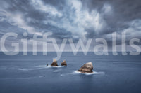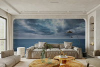 Elevate your space with this evocative image of a stormy ocean and rocky outcrops beneath a turbulent sky. This wallpaper for walls is an amazing choice. The muted blues and grays create a soothing atmosphere, making it perfect for a bedroom, study, or meditation space. The interplay of light and shadow in the clouds adds depth and visual interest. The overall scene harmonizes with modern decor and brings a sophisticated touch. A sense of calm and powerful beauty of the natural world into interiors.