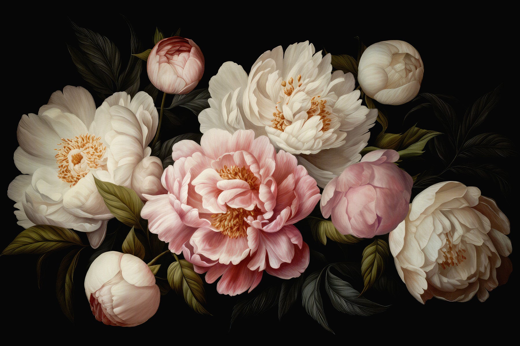 Opulent baroque floral composition featuring lush peonies in full bloom, unfolding in soft pink and ivory tones against a deep black background by Uta Naumann. The dramatic contrast enhances their elegance and timeless beauty, perfect for adding a luxurious touch to interiors. This historical botanical inspired creation by Uta Naumann brings a romantic atmosphere to wallpapers, fabrics, and home decor, celebrating the refined charm of vintage garden florals in modern living spaces.
