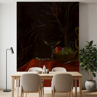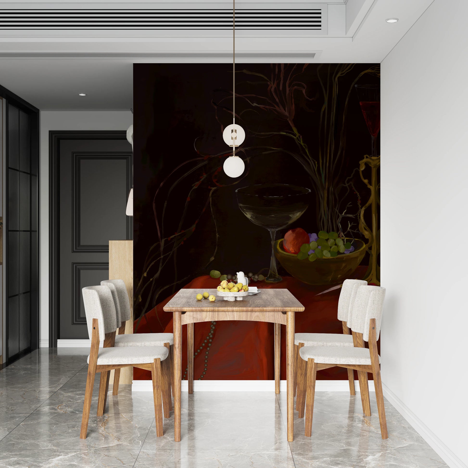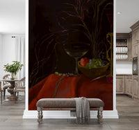 Baroque Still Life Lament, Velvet-Draped Mourning Feast, Somber Opulence Study, baroque art, chiaroscuro, dramatic lighting, moody atmosphere, heavy tablecloth, vintage wine glass, red wine, spilled wine, fruit bowl, ripe grapes, wildflowers, wilted petals, grief symbolism, vanitas, classical composition, dark background, candlelight glow, textured fabric, antique aesthetic, old master style, melancholic mood, shadow play, rustic table, still life painting, oil painting style, rich color palette, deep shadows, somber tones, fallen fruit, symbolic decay, ornate glassware, dramatic contrast, vintage ambiance, contemplative scene, timeless sorrow, European art influence, emotional stillness