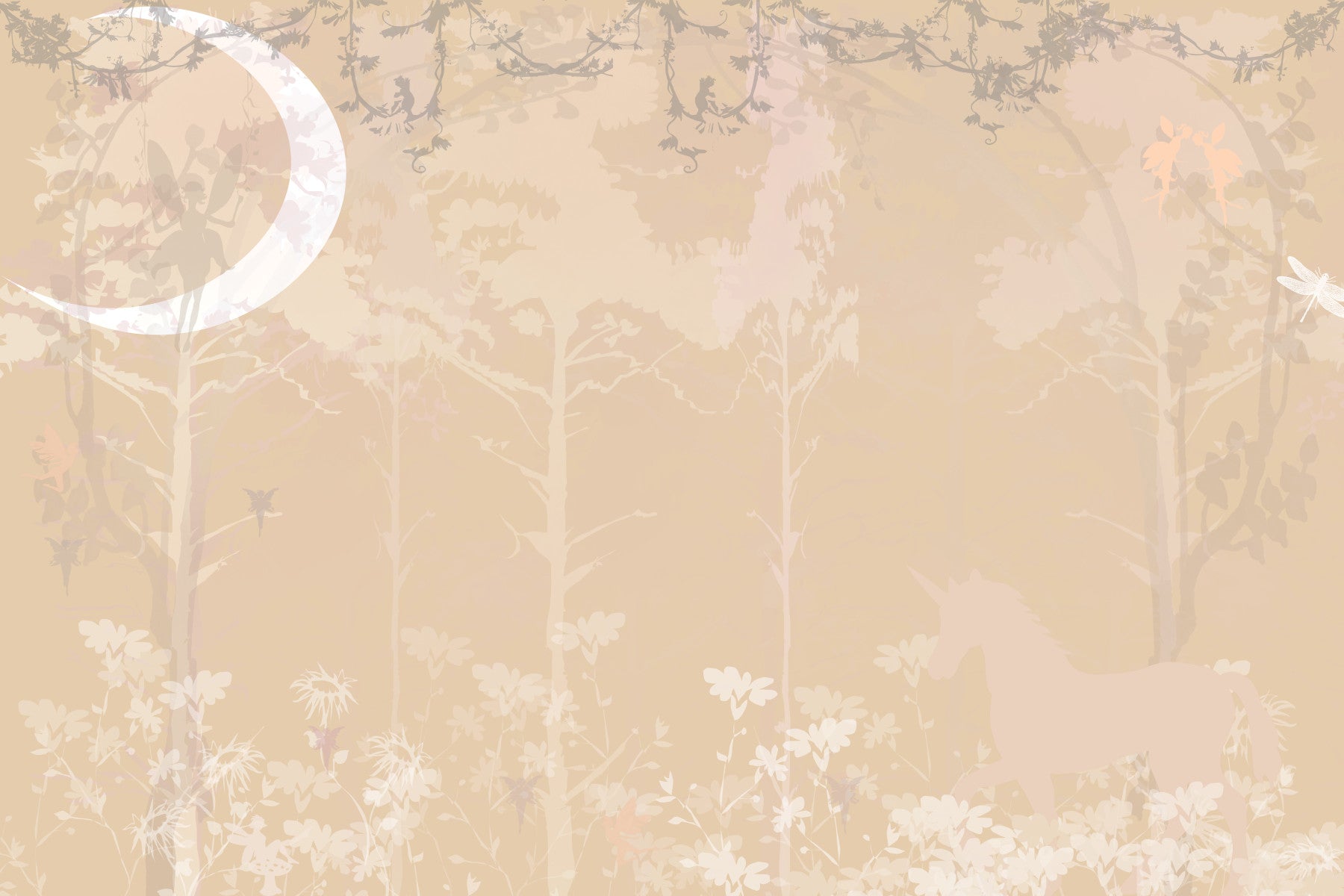 Drift into a realm of fantasy with this enchanting wallpaper for walls. Soft beige tones blend with delicate floral and tree silhouettes, crowned by a crescent moon. Fairy and unicorn motifs spark imagination. This design transforms nurseries, bedrooms, and playrooms into tranquil havens. Its muted palette ensures it complements rather than overwhelms, creating a balanced and inviting atmosphere. The subtle patterns welcome dreams, stories, and joyful play, offering a serene backdrop for childhood adventures.
