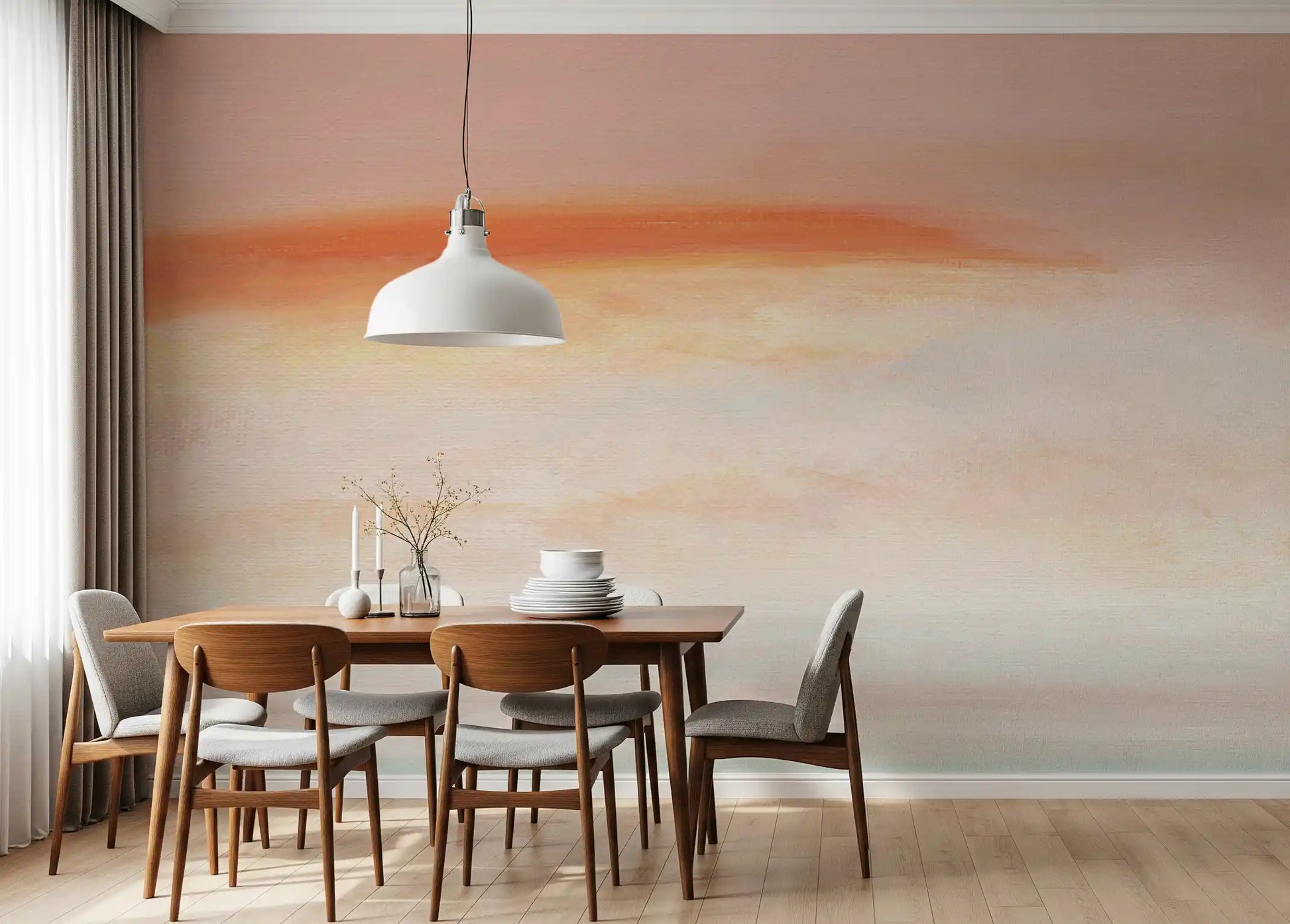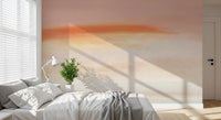 Transform your interior with this captivating abstract wallpaper for walls, featuring a serene gradient of soft, ethereal hues. Gentle brushstrokes layer across the surface, creating a painterly texture that evokes a tranquil dawn or dusk horizon. The color palette gracefully blends delicate peach and apricot tones into warm yellows and creamy beiges, culminating in a subtle, calming blue-green at the base. This design infuses a quiet elegance into any space, fostering a peaceful and inviting atmosphere. It perfectly suits bedrooms, nurseries, living rooms, or meditation areas, adding depth and a touch of artistic sophistication. Experience understated beauty and a harmonious ambiance.