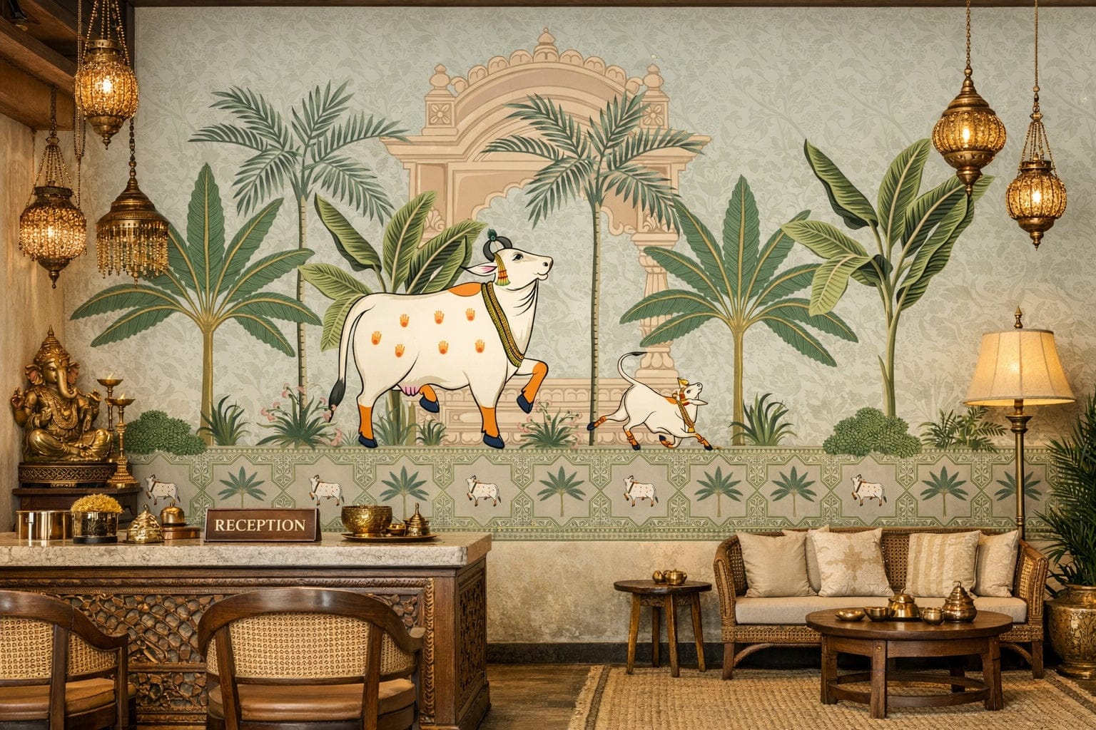 Bring a touch of tradition and elegance to your space with Midnight Grace Pichwai Wallpaper, a stunning Indian wallpaper inspired by heritage art. This design features sacred cows, lush palm trees, and intricate motifs set against a deep midnight backdrop, creating a regal and spiritual ambiance. Perfect as a living room wallpaper, it blends cultural richness with artistic charm, making your walls a statement of grace and devotion. Whether paired with vintage décor or modern interiors, this timeless design adds depth and warmth, celebrating India’s artistic legacy while transforming your space into a serene and visually captivating haven.