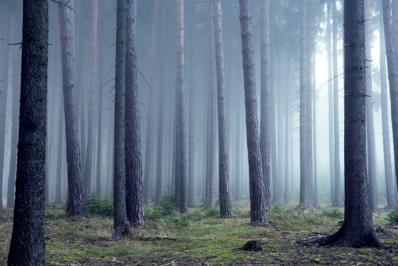 Foggy pine forest wallpaper for a mystical ambiance
