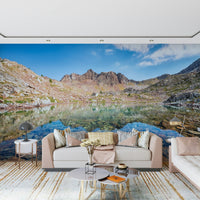 Immerse yourself in the peace of a clear mountain lake with this wallpaper. The design features crystal waters reflecting the surrounding peaks under a bright sky. The rock formations beneath the water's surface add depth. Its cool blues and earth tones bring a calm atmosphere to any room. Install this scenic wallpaper for walls in bedrooms, living rooms, or offices to create a calming retreat. This design smoothly complements modern or rustic interiors, and fills your space with a sense of nature.