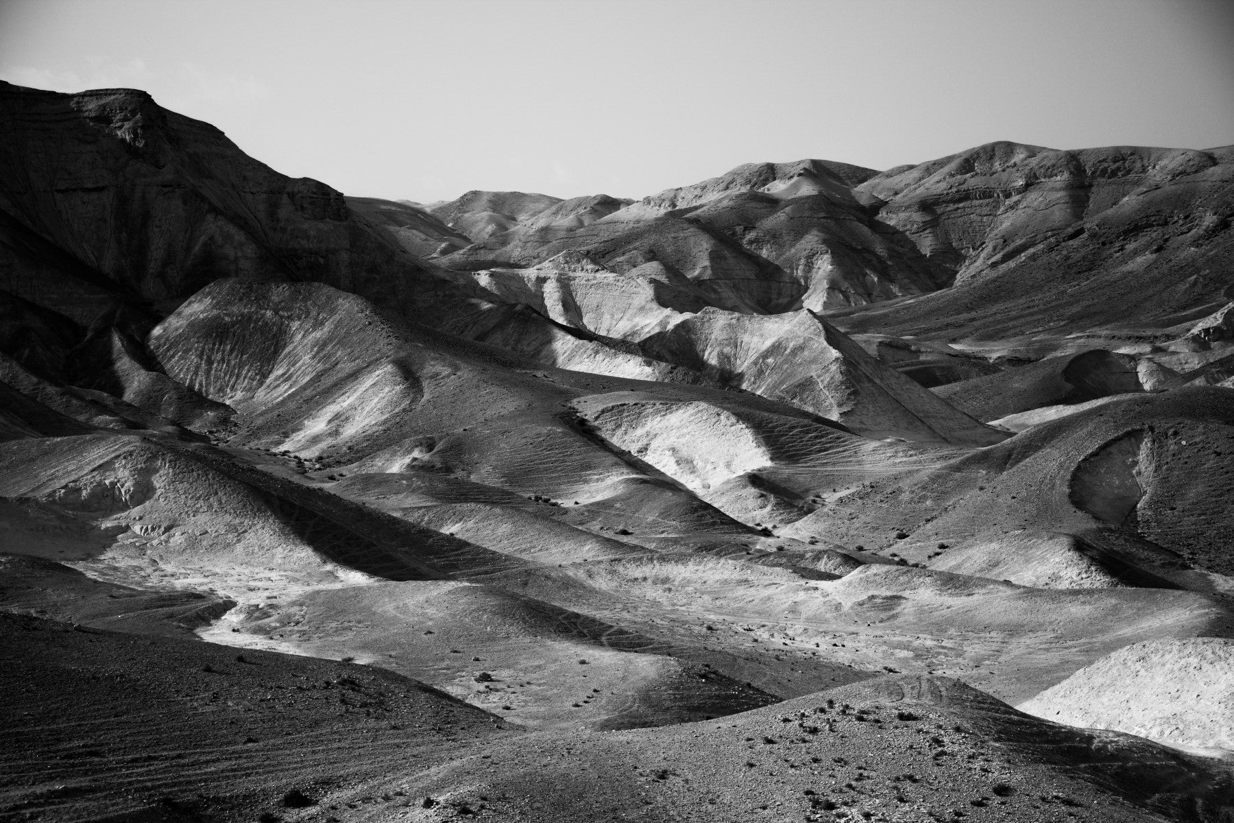 Immerse yourself in the stark beauty of 'Mountains of the Judean Desert 4'. This black and white wallpaper captures the rugged and timeless character of the Judean Desert. The image showcases a panoramic vista of layered mountains, their textured surfaces sculpted by centuries of wind and sun. Sharp shadows and dramatic lighting highlight the undulating terrain, creating a powerful sense of depth and scale. The monochromatic palette enhances the raw, unforgiving nature of the landscape, while emphasizing the subtle variations in tone and texture. This wallpaper evokes a feeling of solitude, resilience, and the enduring power of nature. Bring the austere grandeur of the desert to your screen and experience the quiet majesty of this ancient land.