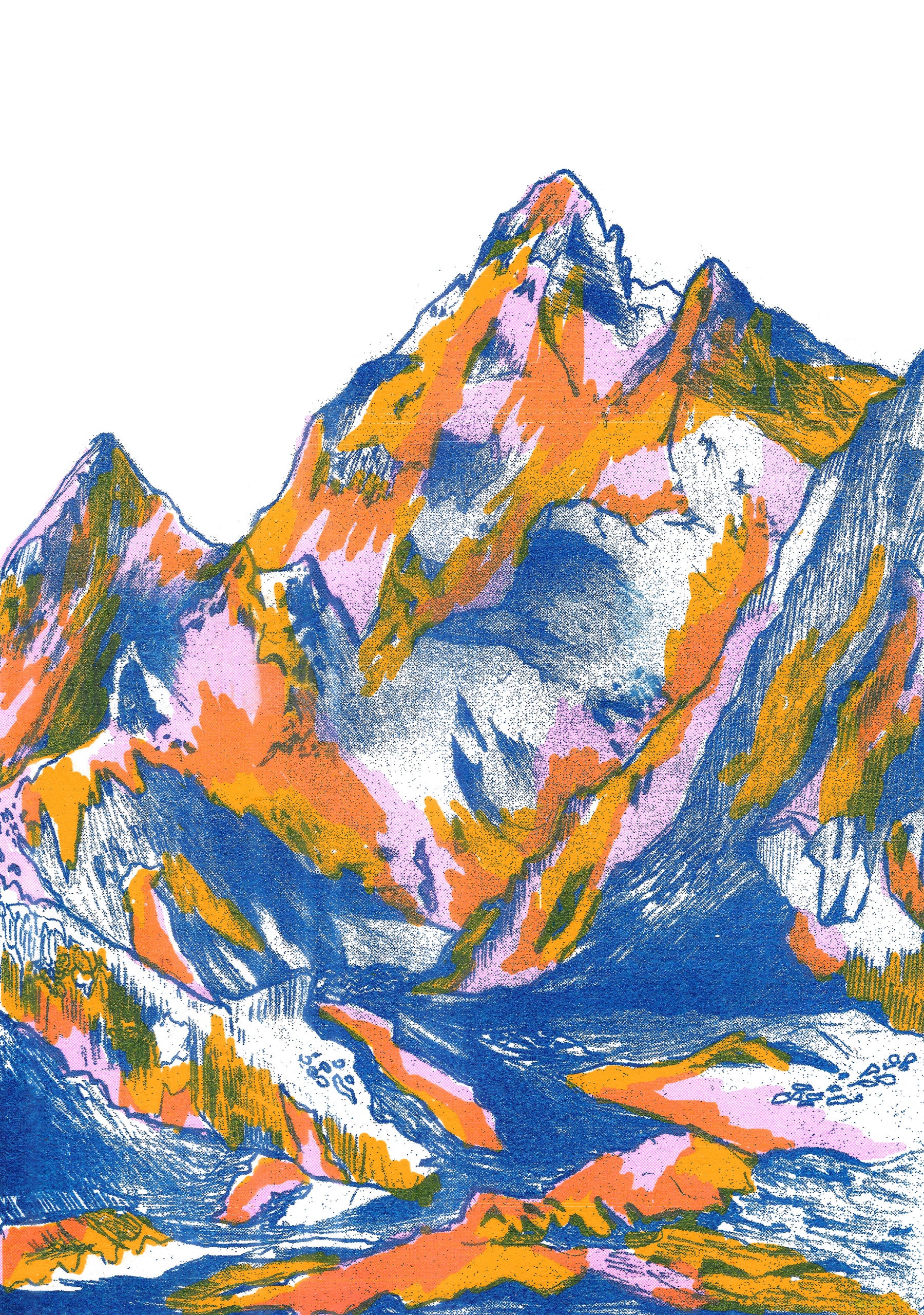 Immerse yourself in the raw beauty and majestic scale of nature with this stunning "Mountains" wallpaper. The artwork features a vibrant and stylized depiction of a mountain range, rendered in a unique blend of bold oranges, deep blues and subtle pinks. The artist's use of textures evokes a sense of depth and ruggedness, inviting the viewer to explore the peaks and valleys within. This eye-catching design brings a contemporary twist to a classic landscape, infusing any space with a sense of adventure and tranquility. Perfect for adding a touch of the wild to your digital world, this wallpaper is sure to inspire awe and wanderlust.