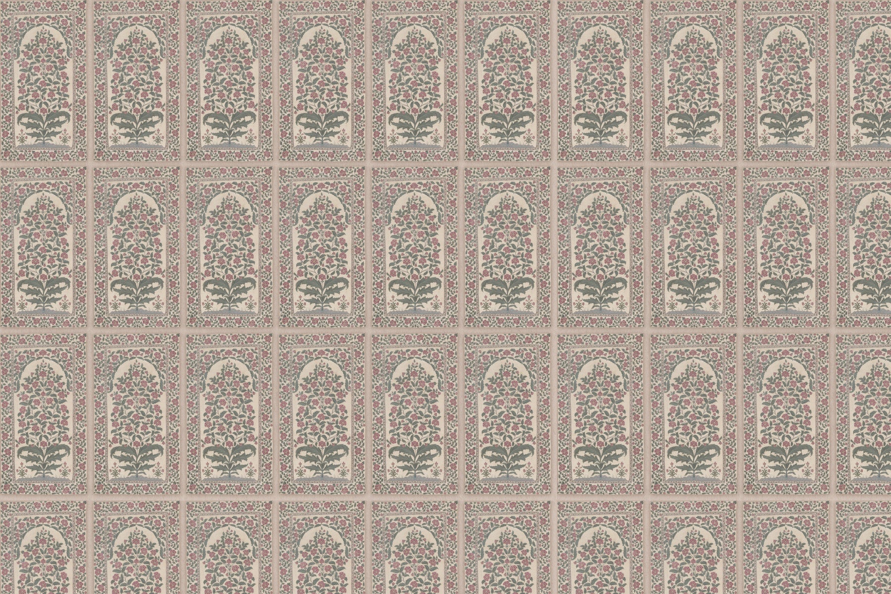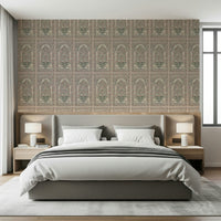 Transform your home into a serene garden with this exquisite wallpaper for walls. Mughal-inspired arches filled with blush roses and sage leaves create an elegant, repeating pattern. The soft, muted palette brings a calming, sophisticated touch to any room. Imagine this adorning a dining room for intimate gatherings or a bedroom for a restful retreat. This floral design offers a subtle texture that will enhance hallways, living rooms, or create a beautiful home office backdrop. It blends beautifully with vintage decor for a rich luxurious effect, or to contrast the clean lines of a minimalist space.