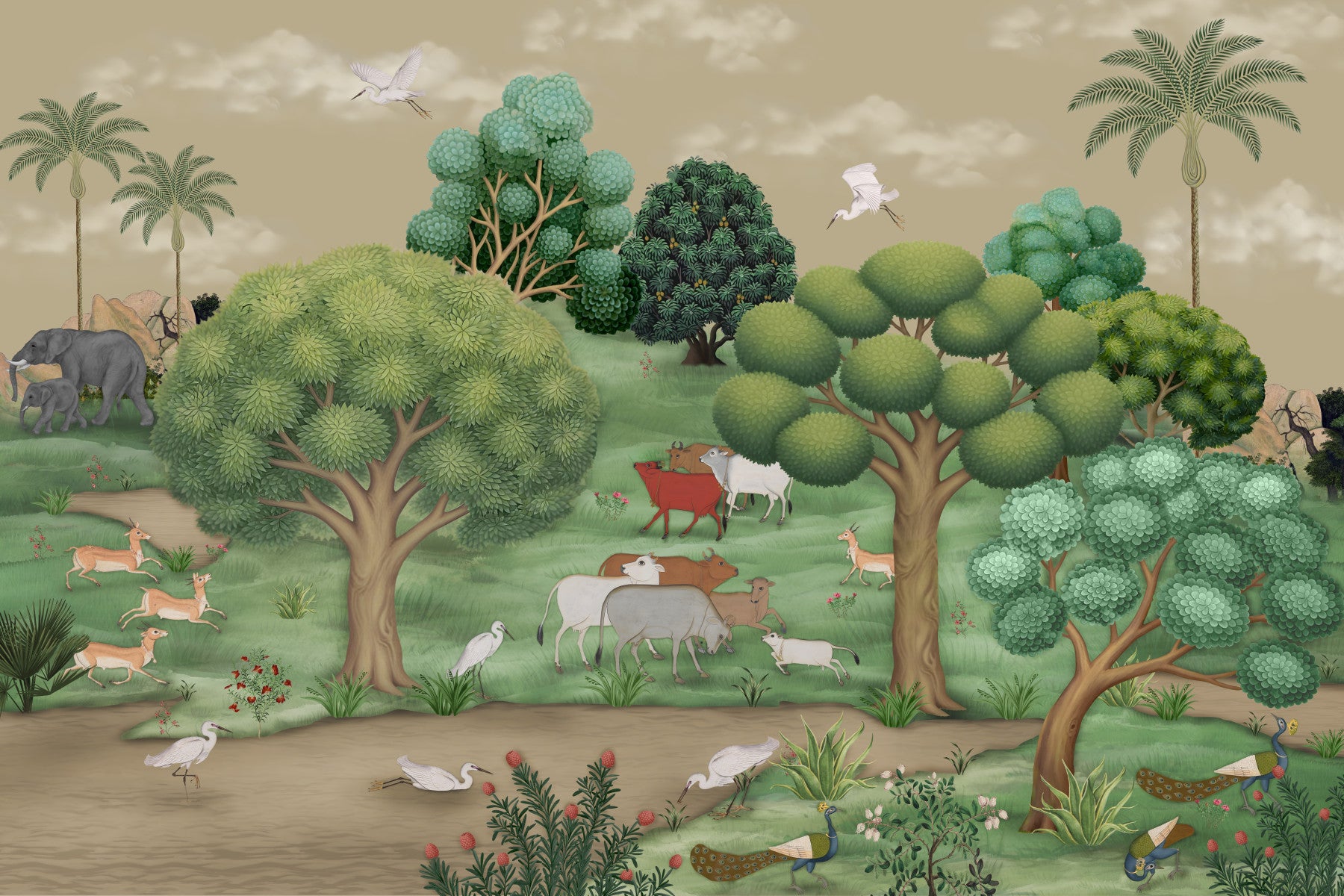 This captivating wallpaper for walls transforms any room into a tranquil, artistic sanctuary. Featuring a lush, hand-painted landscape inspired by traditional Indian art, this design showcases graceful elephants, leaping deer, serene cows, and vibrant peacocks amidst stylized trees and a flowing river. Its earthy green and warm beige color palette creates a calming atmosphere. The intricate details and rich storytelling make it a compelling focal point. This wall covering elevates living rooms, dining rooms, and bedrooms, infusing them with a sophisticated, nature-inspired elegance. It also perfectly complements a cozy reading nook or a culturally rich study.