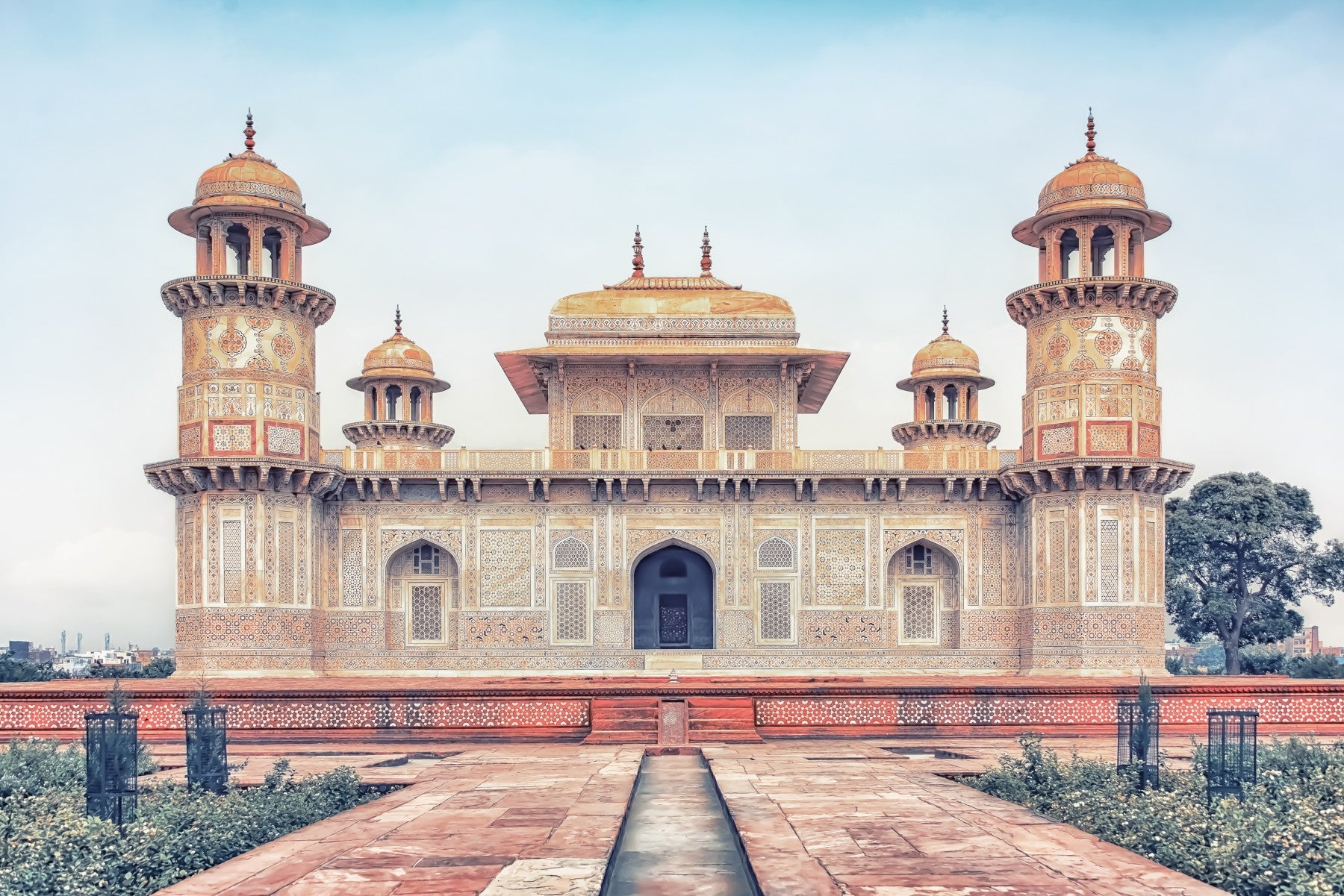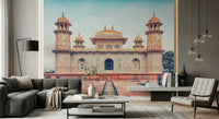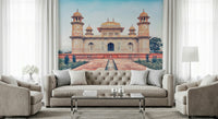 Bring an air of regal beauty to your home with this stunning wallpaper for walls. The intricate details and balanced symmetry celebrate classic Mughal architecture. The design presents a grand mausoleum in muted tones of peach, beige, and light blue. This architectural wonder becomes a focal point, creating a serene and historically rich ambiance. It complements living rooms, hallways, or studies, adding an elegant touch. Let the beauty of this heritage design transform your space into a luxurious sanctuary, where history and art intertwine.