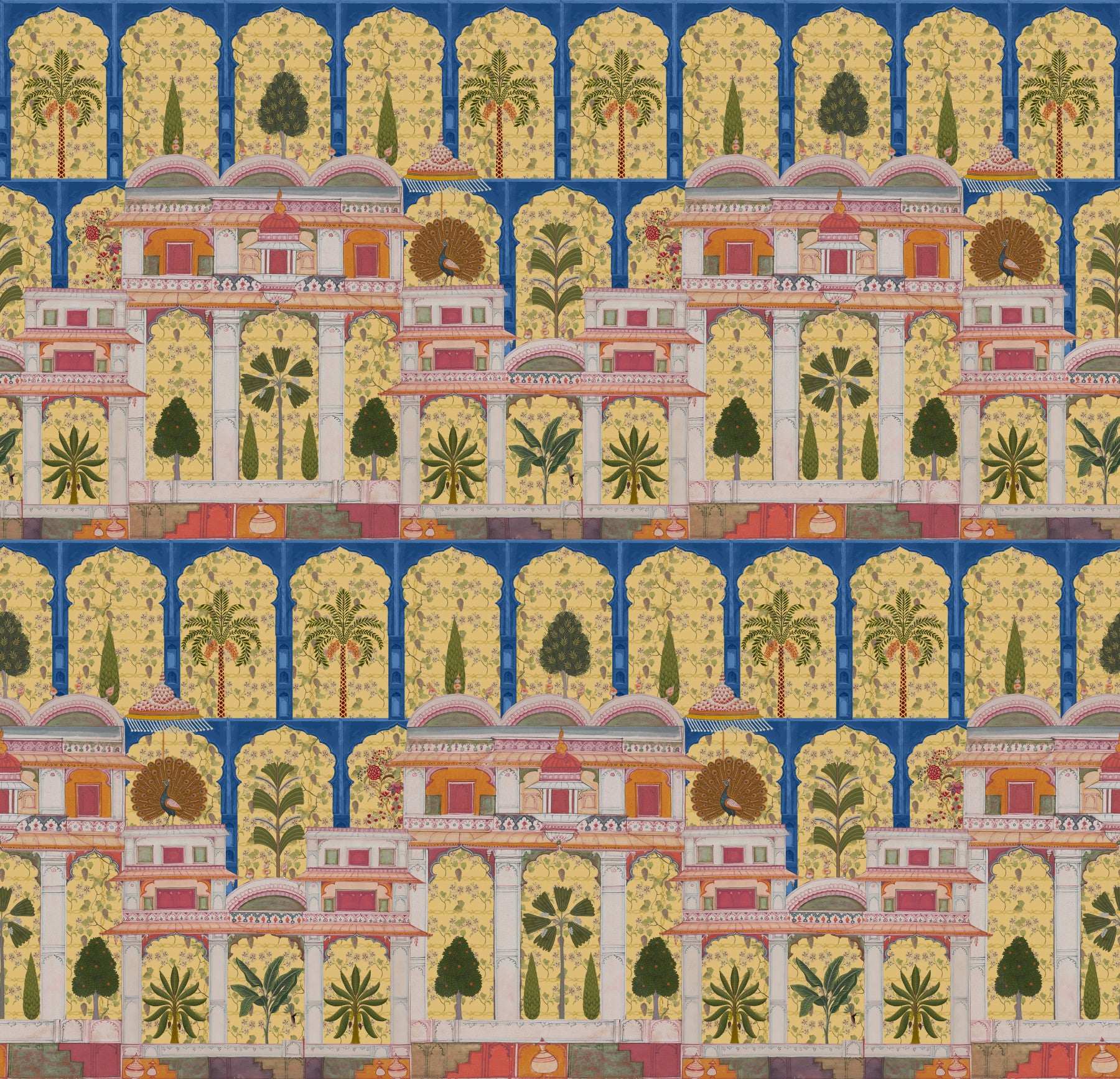 This exquisite wallpaper for walls transforms any room into a grand architectural vista, celebrating timeless elegance. The design features an opulent palace and garden scene, drawing inspiration from classical Indian miniature paintings. Rich blue archways frame a vibrant mustard yellow background, adorned with lush botanical patterns, intricate palm trees, and majestic peacocks. Ornate white columns, terracotta accents, and verdant foliage fill the intricate composition with historical charm. This distinctive wallpaper enhances living rooms, dining rooms, or entryways, creating an atmosphere of regal luxury and serene sophistication. Its warm, inviting color palette and detailed artistry immerse your space in Eastern grandeur, offering a captivating backdrop for elegant furnishings and inspiring tranquility.