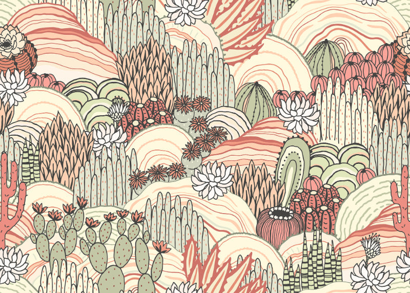 The multicoloured prickly paradise wallpaper is a colourful print of desert plants, including an extensive collection of cacti and succulents. The design distils the spirit of an idyllic desert garden where large saguaros share space with small, round, plump opuntias and long, slender, graceful sansevierias. Every plant is finely drawn, producing a calming yet complex visual surface. Fades of peach, sage, and ochre gently transition into one another, like a basking scene beneath the golden sunlight, with red accents from the blooms of cacti breaking the tableau. The pattern is unbroken across the wallcovering, encouraging the eye to discover new aspects of the plant. This multicoloured wallpaper is a tribute to nature's power and grace, ideal for draping over a space in a botanical cocoon.