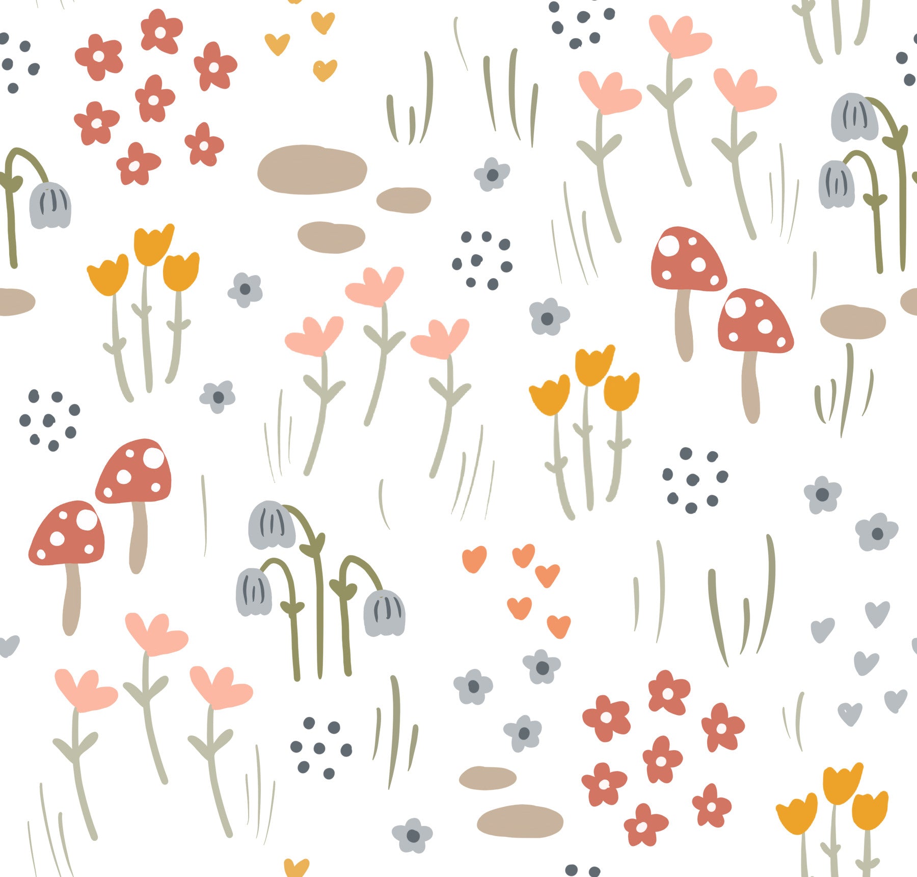 Step into a whimsical 'Mushroom Meadow' where charming hand-drawn flowers in soft pastels and earthy tones dance alongside cheerful red and white speckled mushrooms. Delicate blades of grass and scattered abstract shapes add to the enchanting, fairytale-like atmosphere. This wallpaper offers a serene and playful aesthetic, perfect for adding a touch of whimsical nature to any digital device. The simple yet delightful design evokes feelings of calm and childlike wonder, creating a cheerful and inviting backdrop for your screen.
