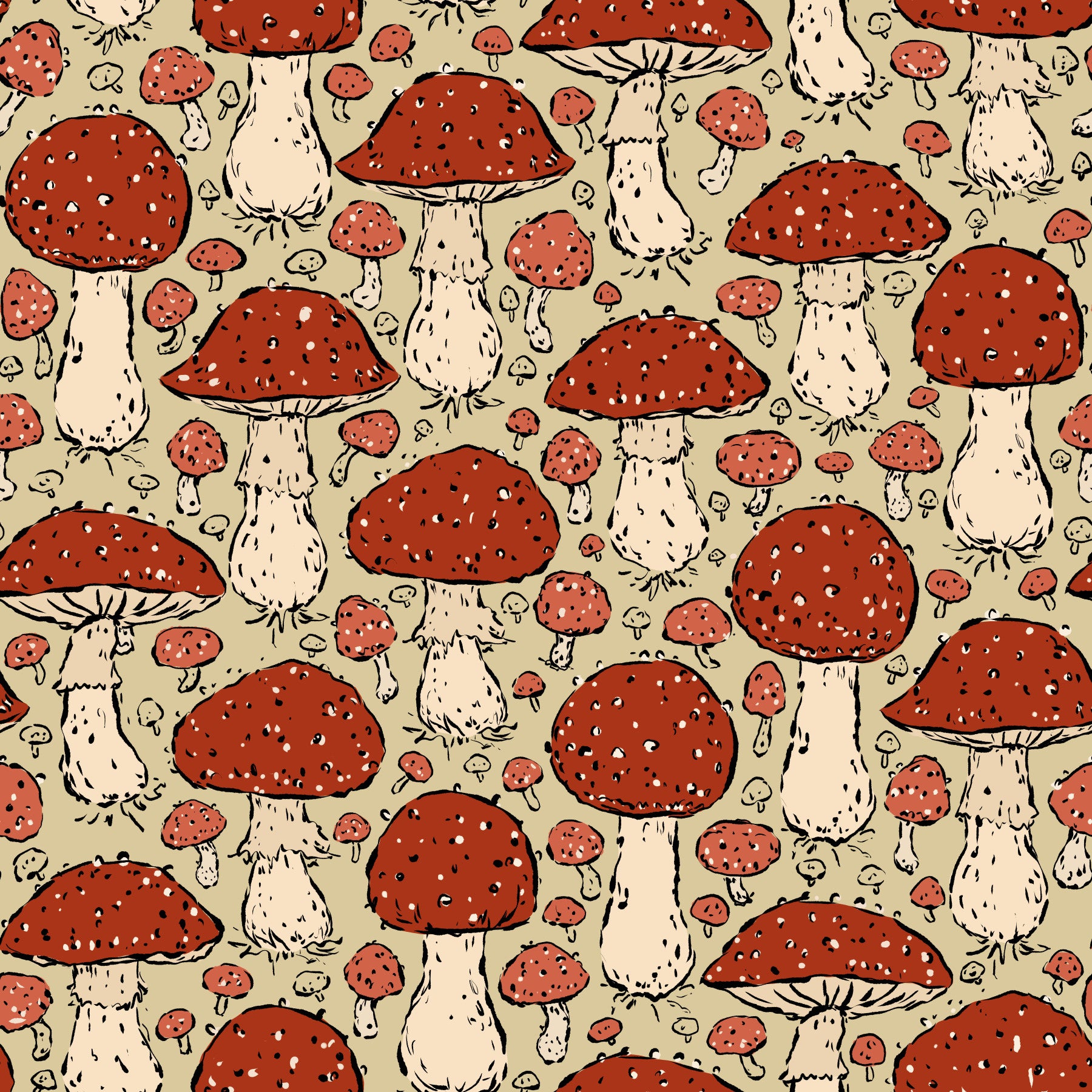 Embrace the whimsical charm of Mushroomcore with this captivating wallpaper. A delightful array of Amanita Muscaria mushrooms, in rich reds and creamy beiges, create a captivating, earthy pattern. The stylized hand-drawn aesthetic adds a touch of vintage charm, perfect for adding a touch of autumnal magic or whimsical fantasy to any digital device. Large and small toadstools are scattered across a soft beige backdrop, creating a mesmerizing and enchanting forest floor scene. This wallpaper offers a unique blend of nature's beauty and artistic expression, perfect for those seeking a calming yet visually stimulating design.