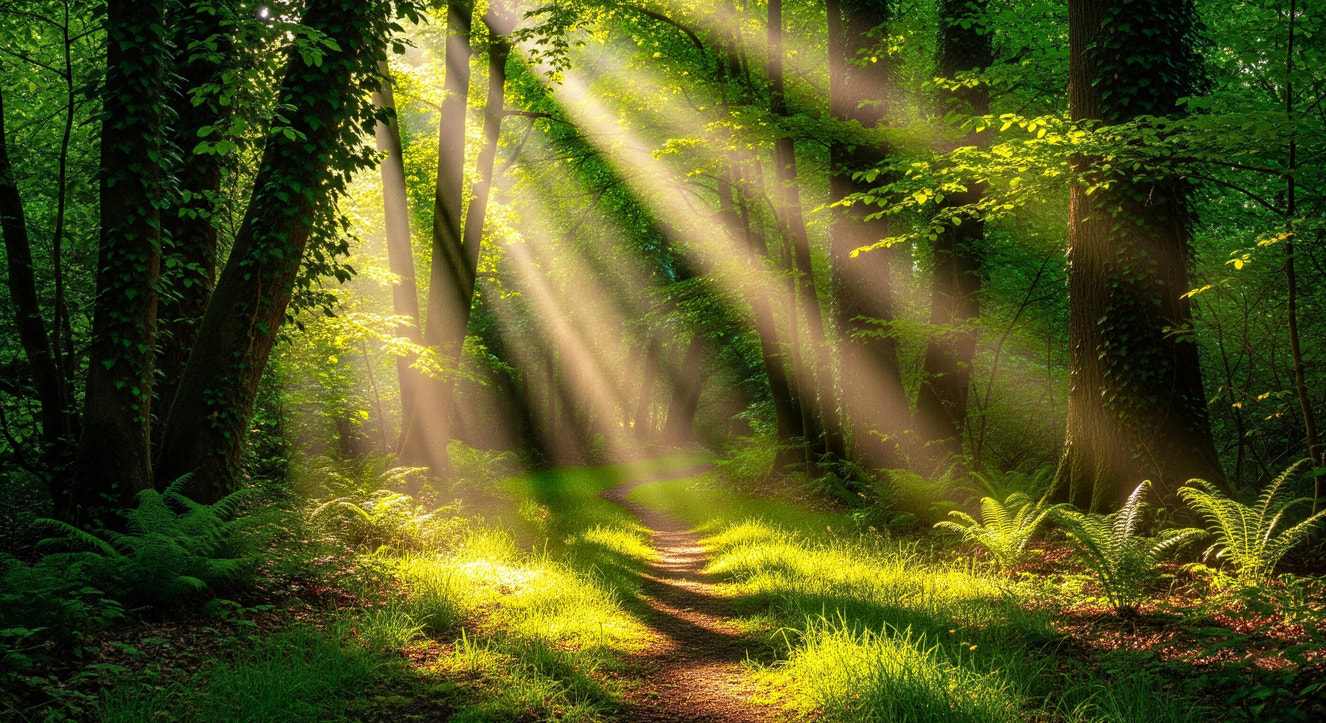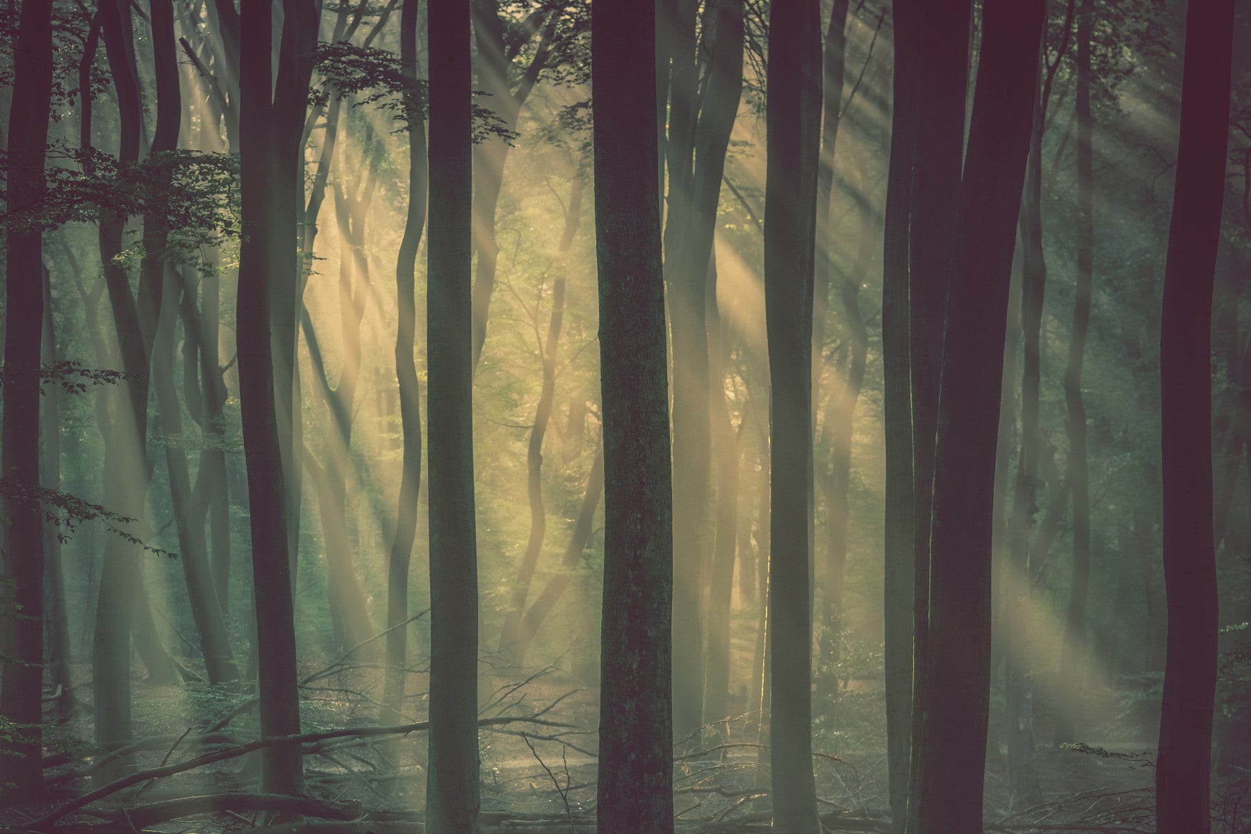 Elevate your interior with this captivating forest, displaying trees filtering the sunlight. The design creates a sense of depth and mystery. The subdued palette of green and brown hues evokes a feeling of calm and peace. This mystical wallpaper for walls adds a touch of natural charm to any space, from a bedroom to a hallway or office. It matches with a modern, rustic, or classic design. Make a statement that is both sophisticated and soothing.