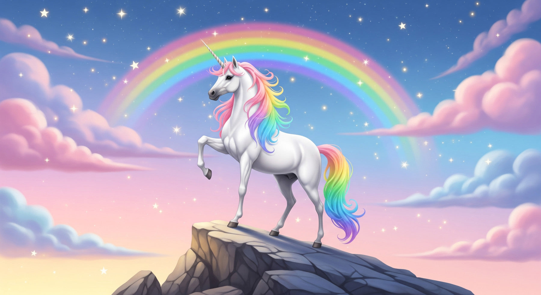 Infuse your interior with wonder by using this dreamy wallpaper for walls. This design showcases a graceful unicorn, its coat as white as snow, adorned with a rainbow mane, striking a pose atop a rocky crag. The backdrop presents a gradient sky dotted with soft, pink-tinged clouds and twinkling stars beneath a bright rainbow. Ideal for a kids’ room or nursery, this wallpaper introduces a playful and imaginative accent. Its soothing colors and enchanting subject create an atmosphere of serenity, transforming walls into a gateway to a world of dreams.