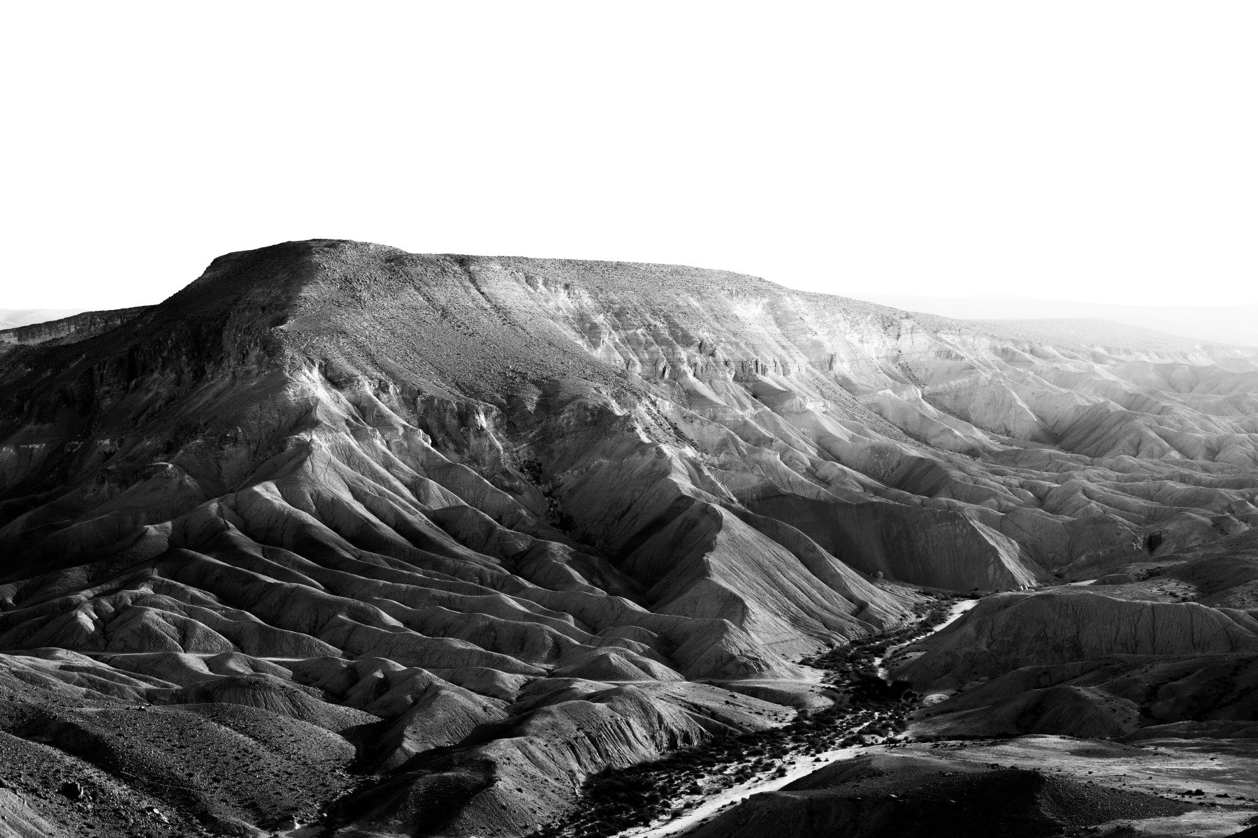 Immerse yourself in the stark beauty of Nahal Zin a monochromatic exploration of Israel's arid landscape. This wallpaper captures the dramatic terrain of the Zin Valley, rendered in striking blacks, whites, and greys. The image portrays the rugged, layered topography, revealing the timeless story etched into the earth by wind and water. A snaking riverbed cuts through the scene, offering a dynamic contrast to the stoic mountains that rise against a bright, almost ethereal sky. 'Nahal Zin' evokes a sense of solitude and grandeur, bringing a touch of the desert's mystique to your digital space. Ideal for those who appreciate minimalist aesthetics, natural landscapes, and the raw power of the earth.