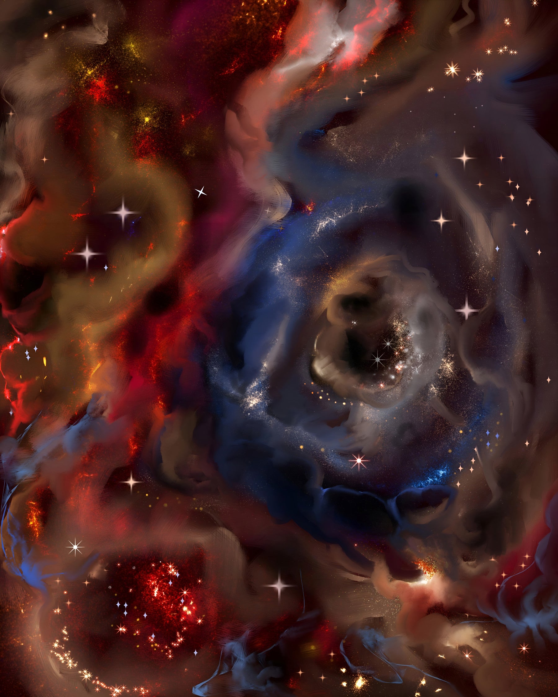 Dive into the celestial tapestry of "Nebulae Cascade," a mesmerizing journey through swirling cosmic clouds. This artwork captures the dynamic dance of interstellar gases and shimmering stardust, evoking a sense of awe and wonder. The vibrant hues of fiery reds and oranges cascade into deep blues and purples, mimicking the birth and evolution of stars within the nebulae. Golden sparkles and radiant astral bodies punctuate the scene, creating focal points that draw the eye deeper into the cosmic abyss. The artistic brushstrokes lend a painterly quality, providing depth and texture to the nebulae, enhancing its ethereal beauty. Let "Nebulae Cascade" transform your screen into a portal to the universe, a constant reminder of the infinite possibilities and breathtaking grandeur that lie beyond our world. Perfect for adding a touch of cosmic elegance and serene beauty to your digital space.