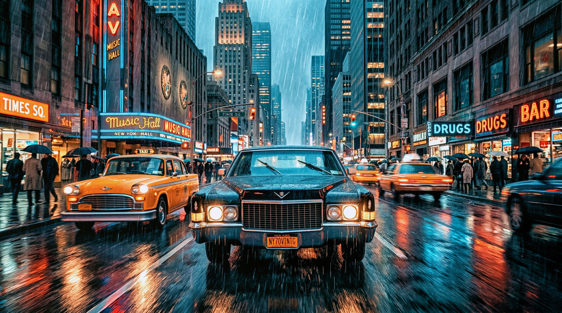 Immerse your space in the dynamic energy of a rainy New York City evening with this captivating wallpaper for walls. Vintage automobiles, including a bright yellow taxi, cruise down slick streets, reflecting the city's brilliant neon glow. Towering skyscrapers frame the bustling scene, illuminated by electric teal and warm orange lights from iconic signs like 'Music Hall' and 'Times Sq.' Pedestrians with umbrellas add to the atmospheric charm, creating a cinematic urban tableau. The rich palette of deep blues, contrasting yellows, and fiery oranges infuses any room with a dramatic, nostalgic ambiance, making it a compelling focal point in a living room, study, or entertainment area.