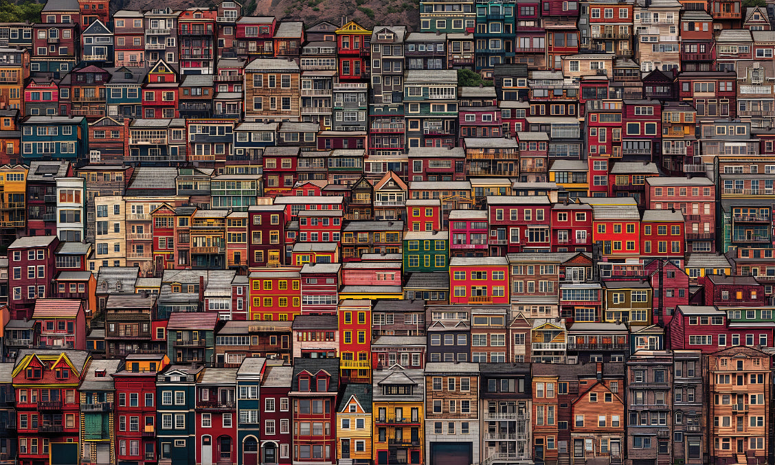 Let yourself be enchanted by the life of a thrumming city with the Nested Neighborhoods Urban Wallpaper. The design comprises an enticing assortment of beautiful, closely-knit townhouses. Deep shades of red, green, yellow, and brown are delightful at providing depth and vibrancy to any space. This wallpaper balances the energy of downtown life with melted comfort, making the space a community that lays warmth on the heart. Best suited for feature walls, this design invites the very essence of the soulful art city into your home.