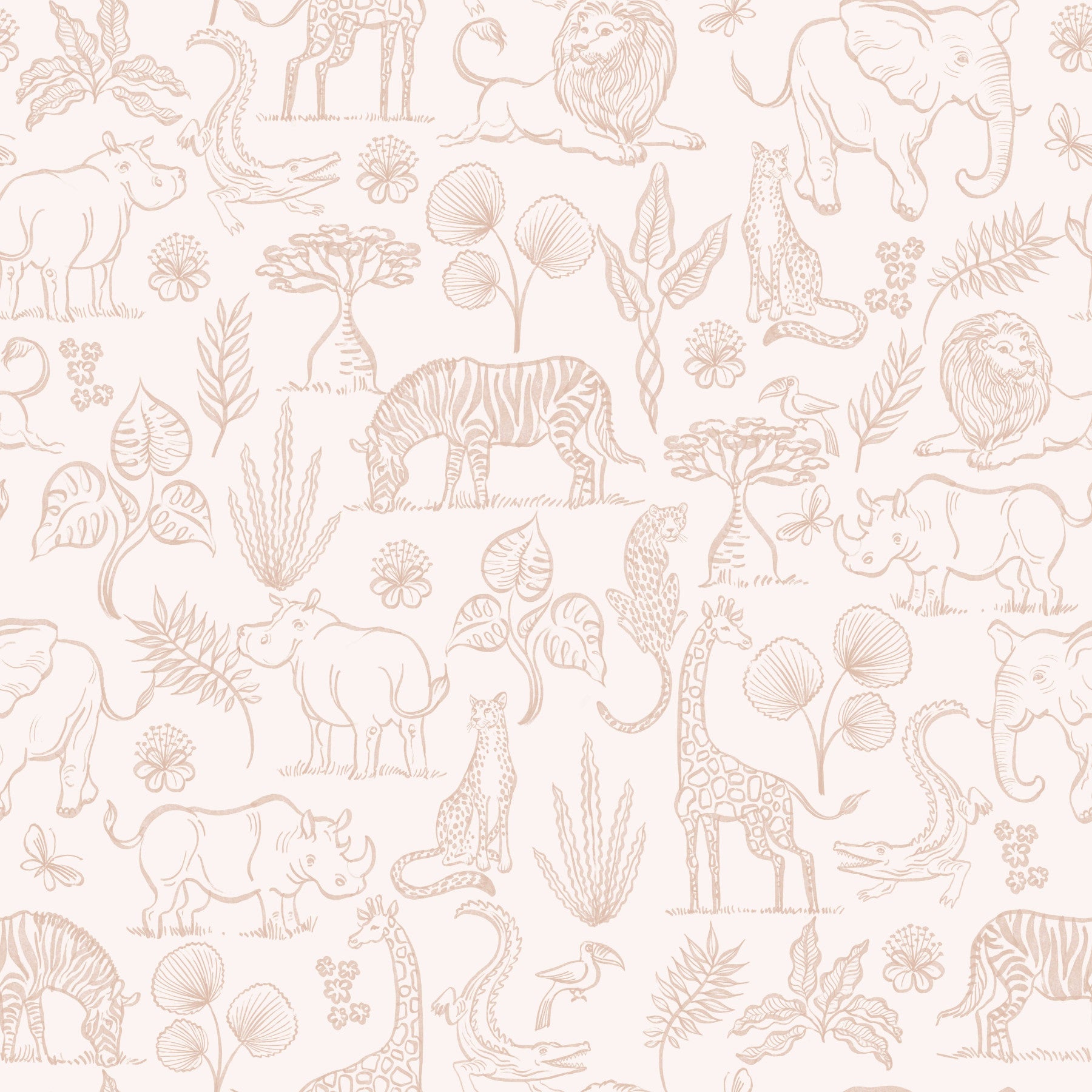 Embark on a serene safari adventure with this elegant wallpaper. Delicate, blush-toned line drawings of iconic African wildlife—lions, giraffes, zebras, rhinos, and elephants—blend seamlessly with lush tropical foliage. The neutral color palette creates a calming and sophisticated atmosphere, perfect for adding a touch of wild beauty to any space. This sophisticated design offers a unique blend of nature and tranquility, ideal for those seeking a peaceful yet adventurous aesthetic. The repeating pattern ensures a cohesive and visually pleasing effect, bringing a sense of the African savanna to your home or office.