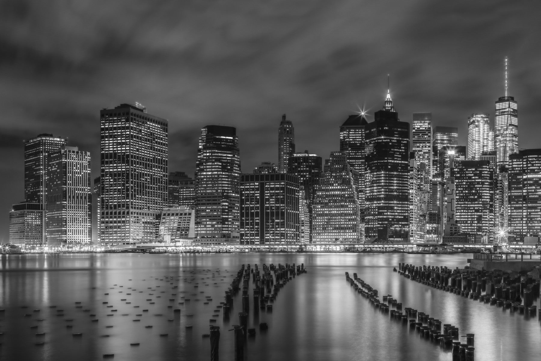 Dramatic mural of Manhattan at night in grayscale tones.