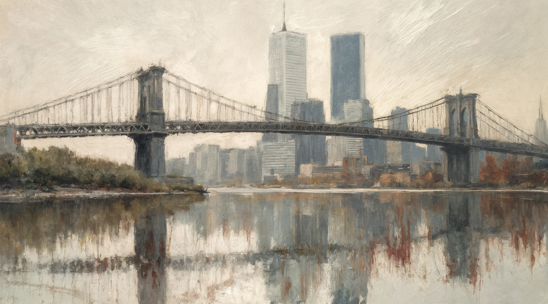 Capture the city's reflection with this skyline view. The bridge stretches across a serene body of water, mirroring the towering skyscrapers. The overall design has a painterly quality with a soft color palette that brings peace to any space. This wallpaper for walls presents a tranquil scene. Install it in a living room or office to bring a gentle reminder of urban beauty. Its neutral colors work well with modern and industrial decor.