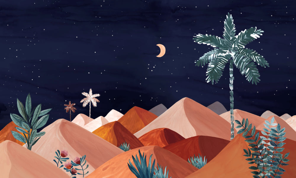 Surround your space with the lunar grandeur of our nighttime oasis wallpaper nature. This magical mural depicts the stillness of desert twilight as evening gives way to night. The peace pair of the desert flora, fixed and immobile in the setting sun of a moon crescent, tells the day what it was experiencing. Perfect for anyone, if you are ever short for ideas on making your space feel real and natural this wallpaper allows being more than just an object. Every catch of the eye gets more of nature's pristine beauty. Nighttime Oasis This mural is available now to bring a sense of calm into whatever corner or wall it is posted on.