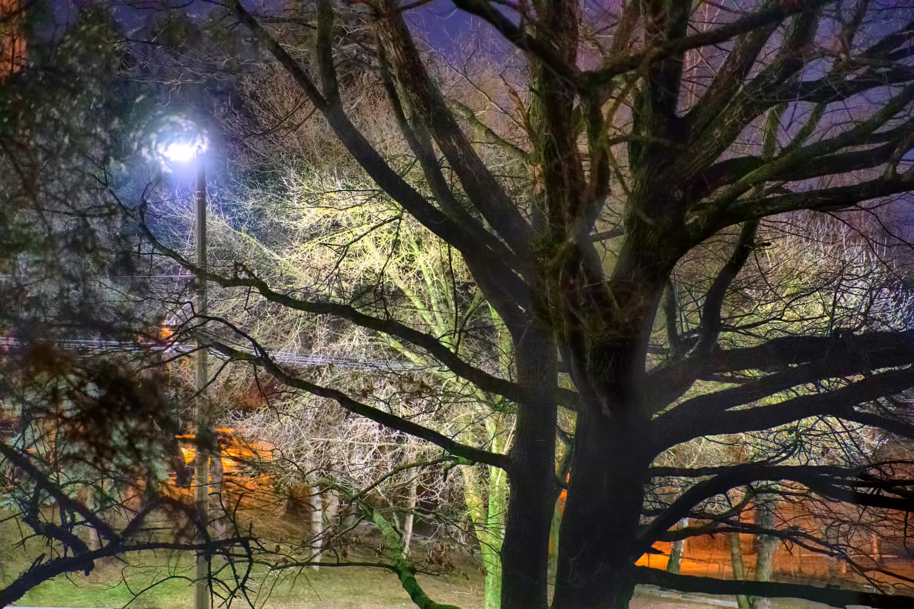 This striking artwork presents a nighttime view of a tree silhouetted against a softly lit park. The intricate branches reveal a delicate interplay of light and shadow, creating a serene atmosphere that invites contemplation. Perfect for adding a touch of tranquility to your living space, this artwork embodies the beauty of nature at night. Enhance your home decor with this unique piece that speaks to the quiet elegance of the outdoors.