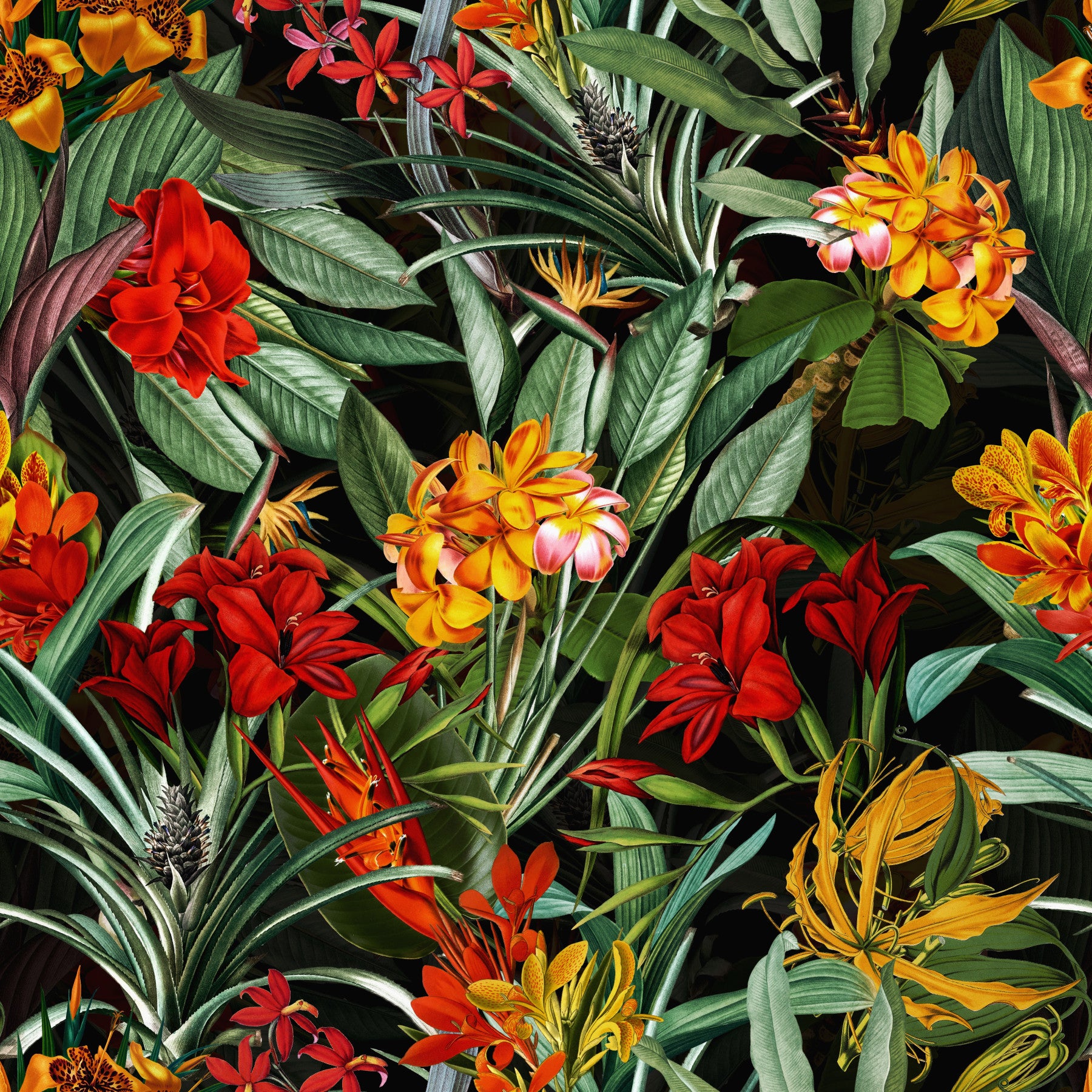 Escape to the enchanting world of 'Nocturnal Bloom,' a wallpaper design that captures the magic of a tropical night garden. Vibrant blooms in shades of deep red, fiery orange, and warm yellow illuminate the darkness, their beauty enhanced by the rich, dark green backdrop of lush foliage. The interplay of light and shadow creates a mesmerizing effect, evoking a sense of mystery and tranquility. Perfect for adding a touch of exotic charm to bedrooms, living rooms, or any space that craves a sense of luxurious escape, this design offers a sophisticated and mesmerizing aesthetic. The high-resolution quality ensures a stunning visual impact, immersing you in the beauty of the night.