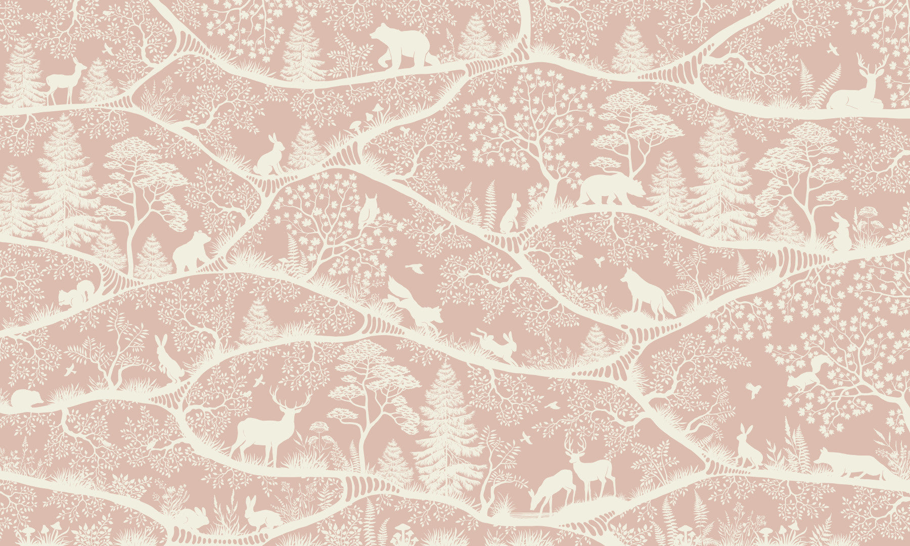 Immerse your living space in the serene charm of Nordic Nature with this enchanting wall décor. A delicate ballet of soft pink and gentle white hues transforms any room into a tranquil forest sanctuary. This intricate design showcases a whimsical woodland teeming with life, where majestic deer, playful rabbits, watchful bears, and cunning foxes roam amongst towering pine trees and leafy deciduous groves. Every detail, from the delicate ferns and wildflowers to the soaring birds, is rendered in elegant silhouettes that dance across undulating hills. Perfect for creating a calming atmosphere in a nursery, bedroom, or cozy reading nook, this artistic expression brings the peaceful beauty of a Northern forest indoors, inviting a sense of wonder and calm to your walls. Experience the quiet magic of nature's embrace.