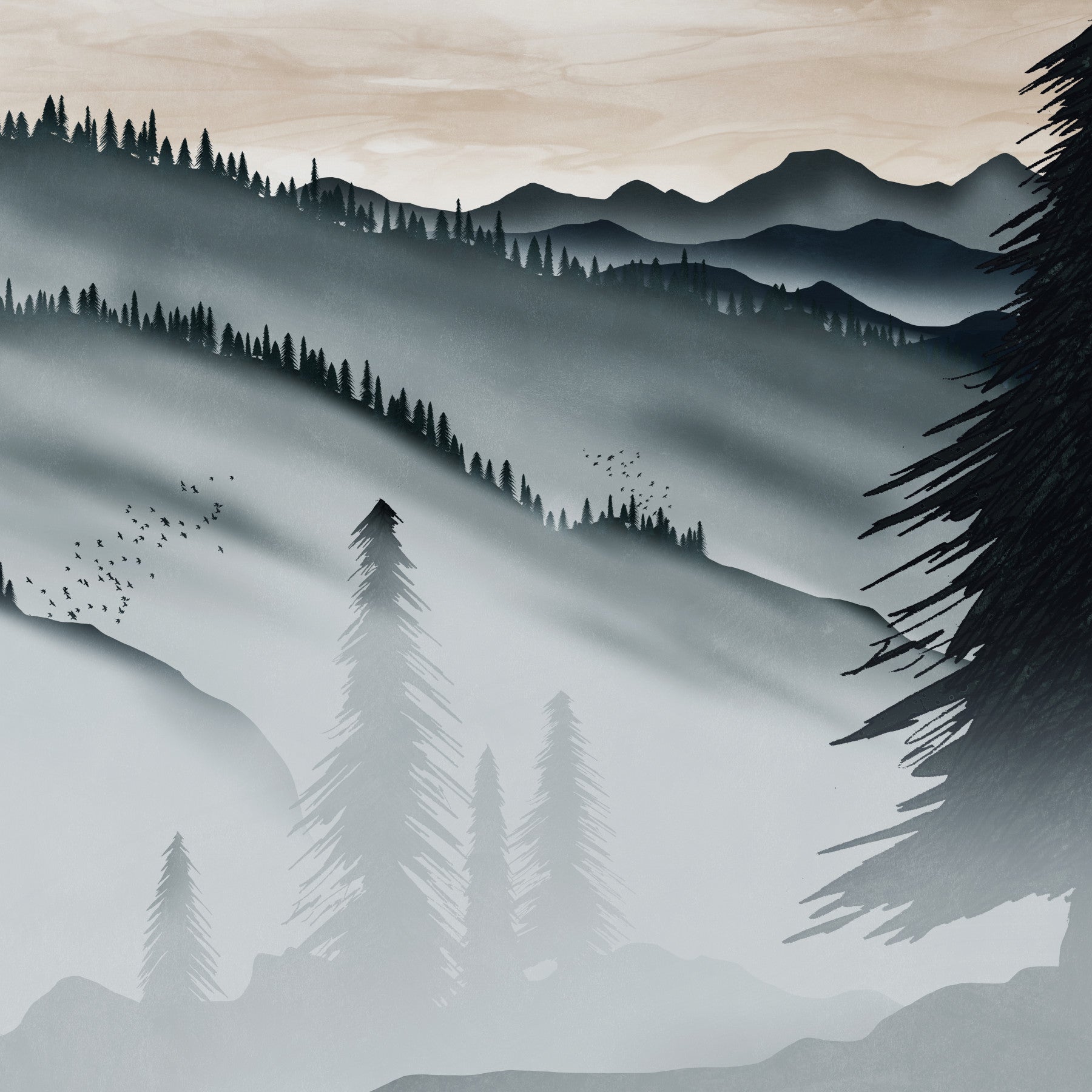 Mountain pine forest wallpaper in greys