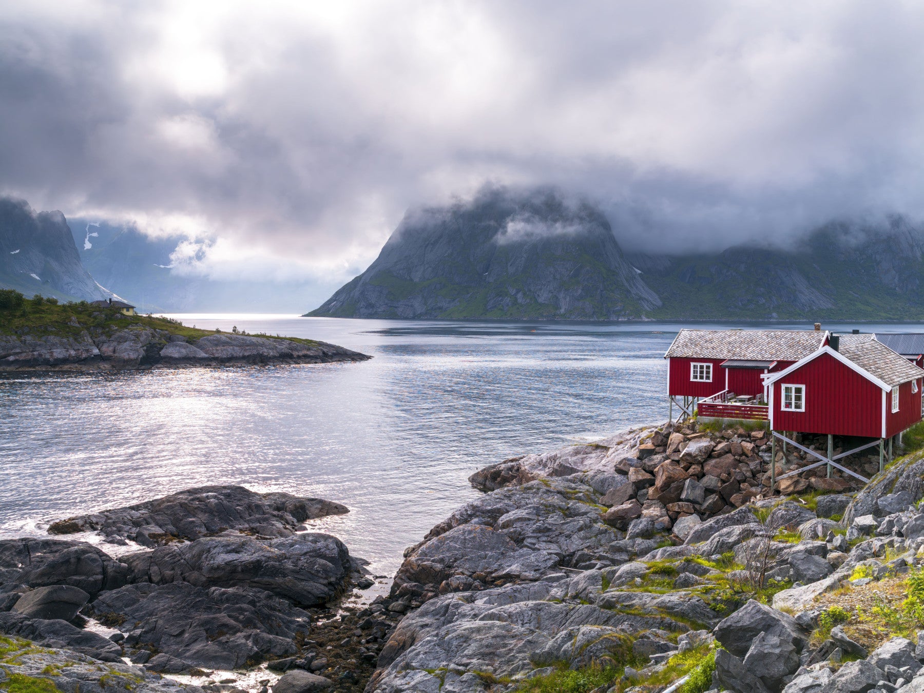 Isolated coastal timber house in Norwegian Fjord Wall Mural.